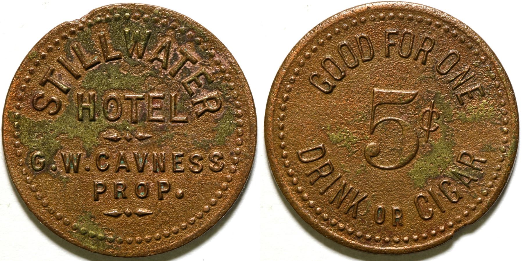 Extremely rare town. Obv.: Stillwater / Hotel / G. W. Cavness / Prop.; Rev.: Good for / 5c / Drink or Cigar. Br., rd., 25 mm. The Stillwater Hotel was torn down in 1946. City: Stillwater State: Nevada Date: