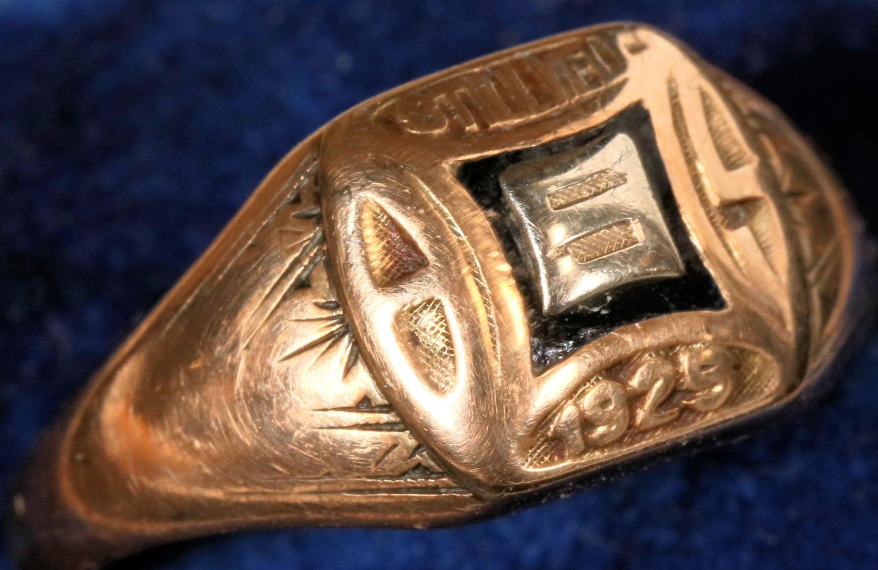 Size 8 ring, engraved "R / W / B" inside. Stillweld 1925 on the face. Tests 10 carat. 4.4 grams.