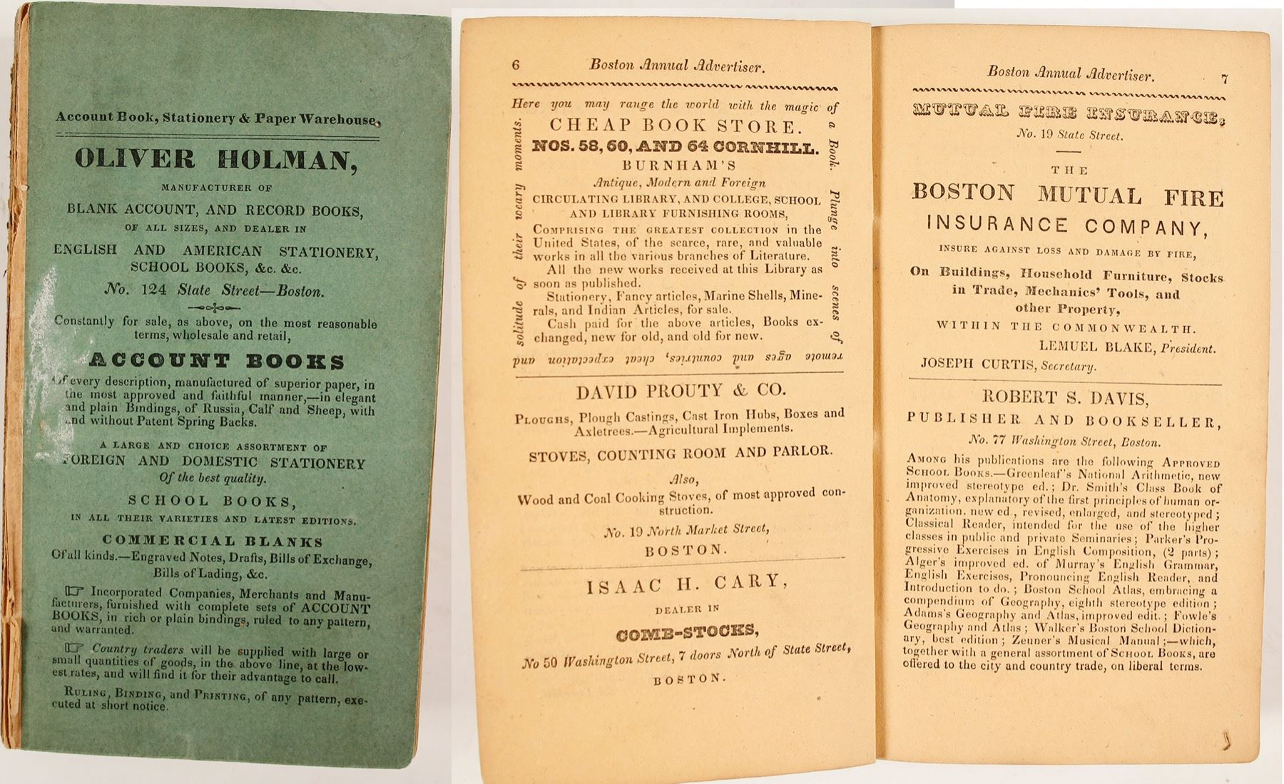 This small but thick volume includes a folded map of the Boston area adjacent to title page. 451 pages plus advertisements. Front and back boards are missing, but the rest is still present. This is a nice, but scarce, early Boston directory that is good for California Gold Rush research, etc.