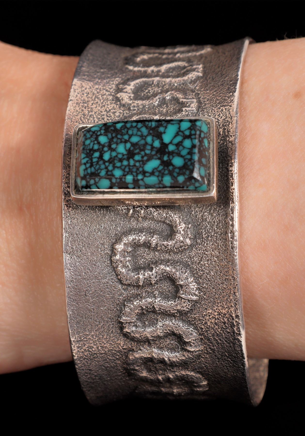 Precision carving deep into the casting sand to achieve a dramatic relief in the design. Smooth, yet stippled, surface. Raised setting with rectangular turquoise (possibly Landers) stone. Maker's mark unreadable, "Sterling". One of a kind piece. Inside measure, 5.5" opening, 1.25".