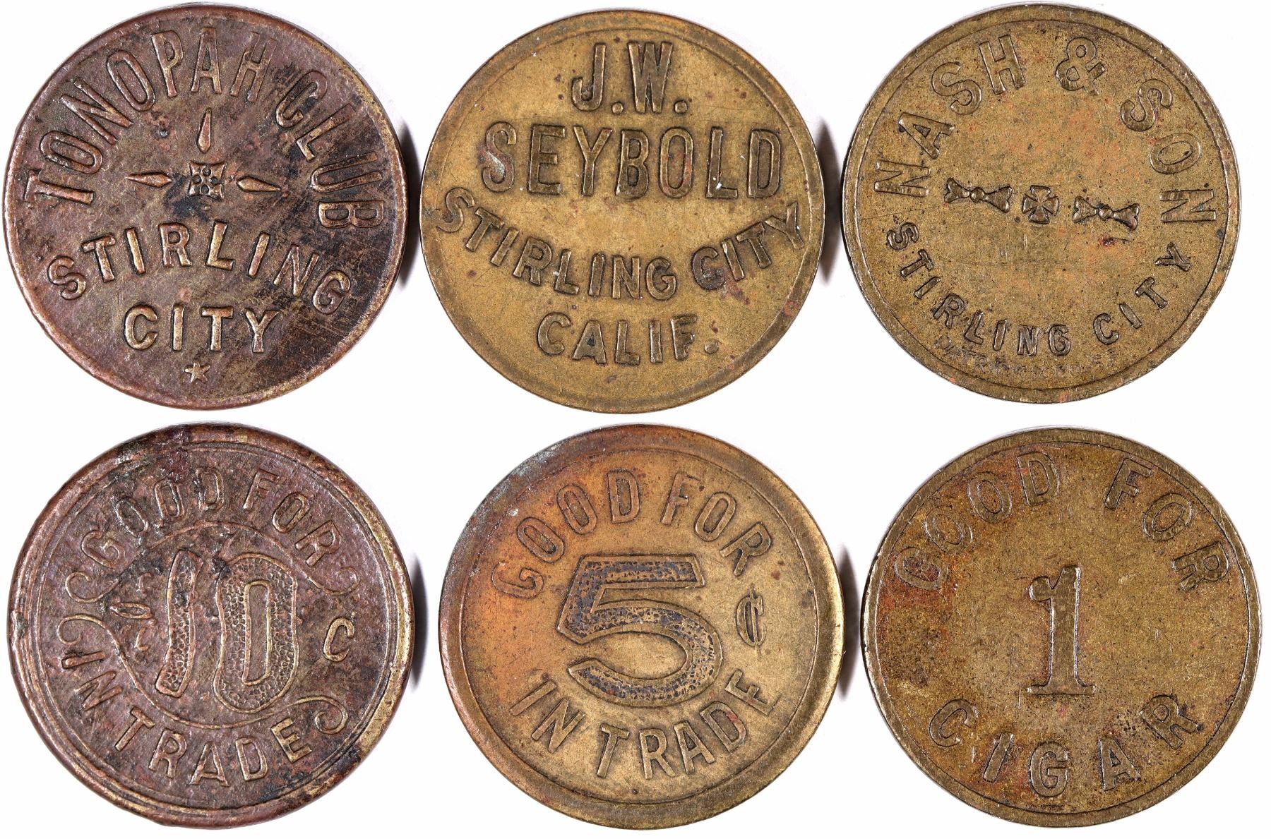 Lot of three tokens from Butte County: 1) NASH & SON / STIRLING CITY / PATRICK & CO. S.F. // GOOD FOR / 1 / CIGAR; Br. rd., 21 mm. 2) J.W. / SEYBOLD / STIRLING CITY / CALIF. // GOOD FOR / 5¢ / IN TRADE; Br. rd., 21 mm. 3) TONOPAH CLUB / STIRLING CITY // GOOD FOR / 10¢ / IN TRADE; Br. rd., 21 mm. Ex Ron Lerch collection.