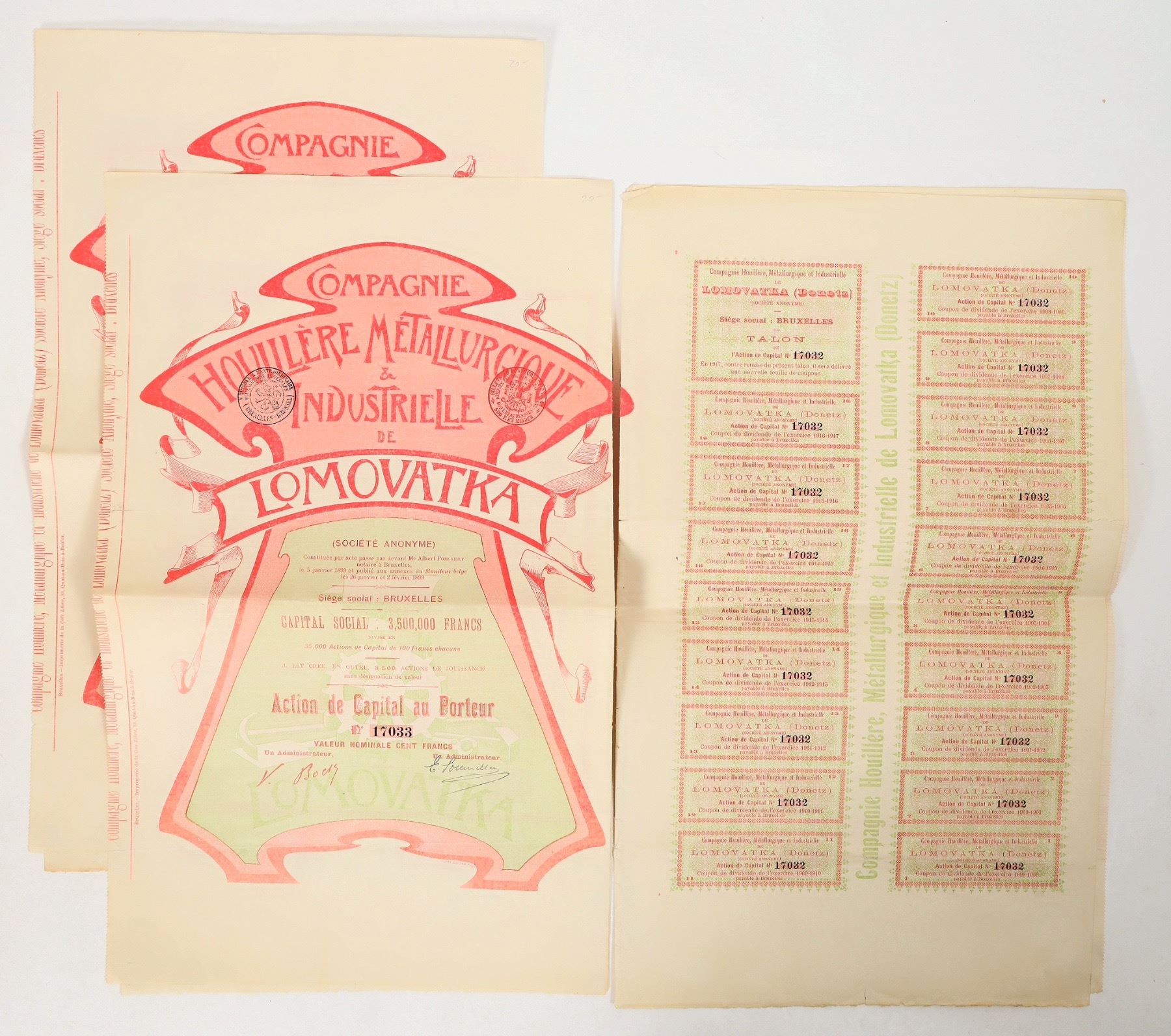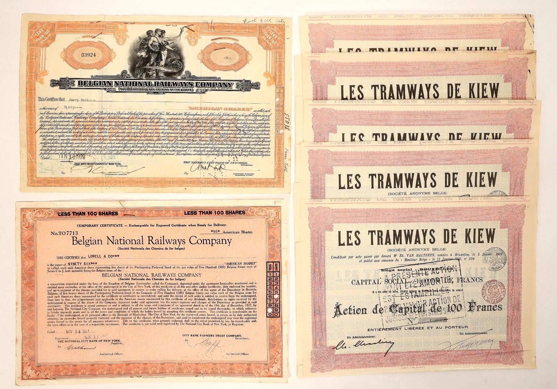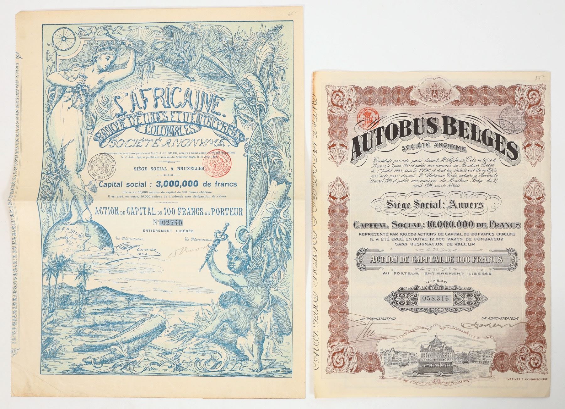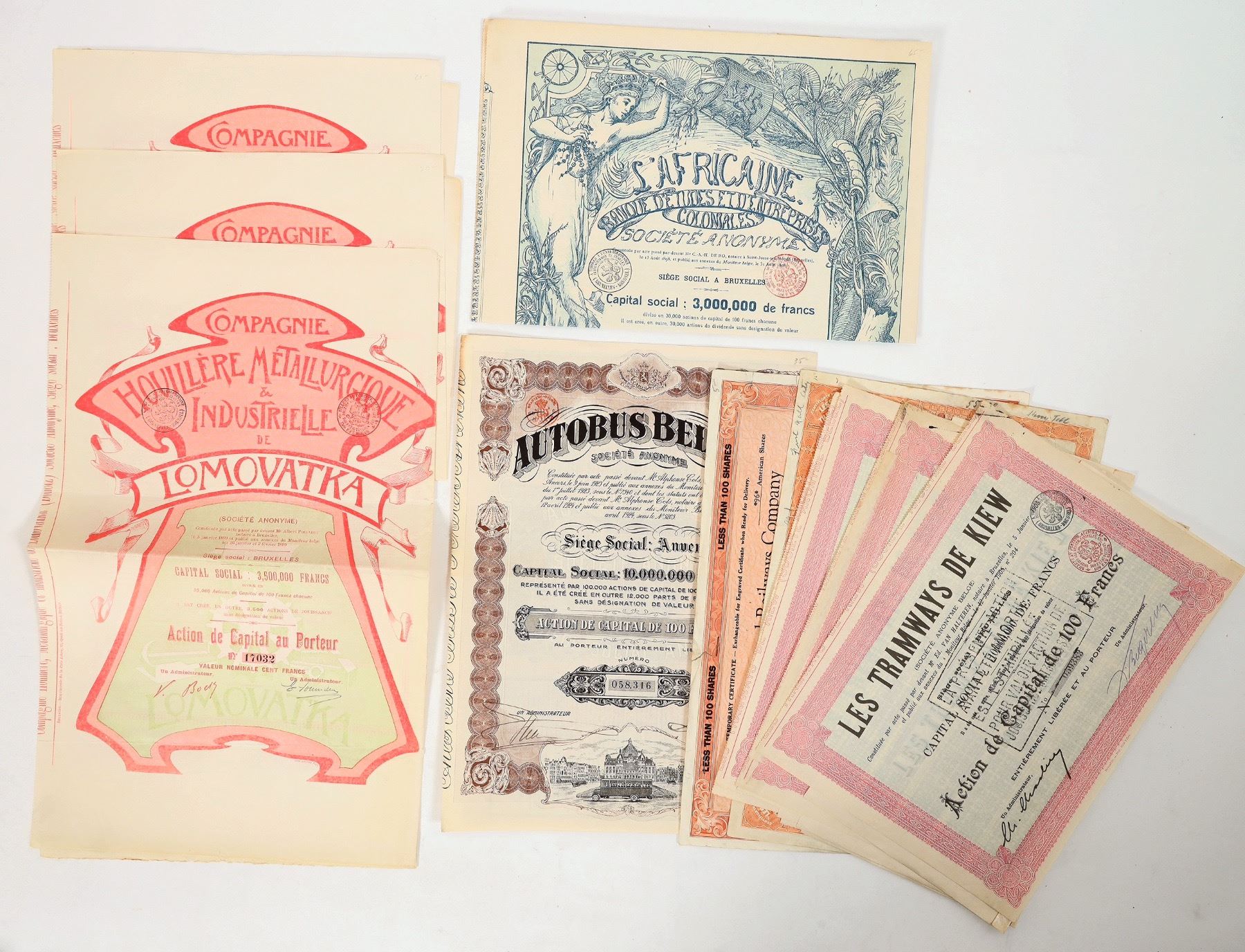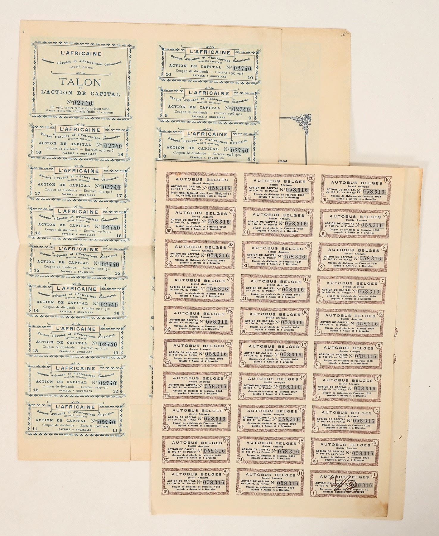 Lot of 12 Bonds have coupons attached. Five are I/U : Autobus Belges, LíAfricaine, Compagne Vovillere Metallurgiove. Some are cancelled by punch holes. Fair to fine cond.[ Belgium Ken Prag Collection