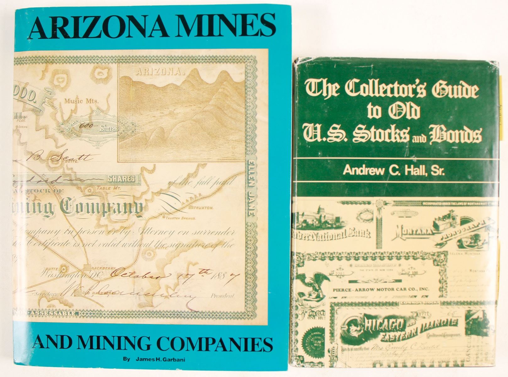 1) The Collector's Guide to Old U.S. Stocks and Bonds by Andrew C. Hall Sr.,signed by author. c.1984, pp. 227; 2)Arizona Mines and Mining Companies 1854-1954 by James H. Garbani c. 1993, pp.307. Date: Location: HWAC# 63453