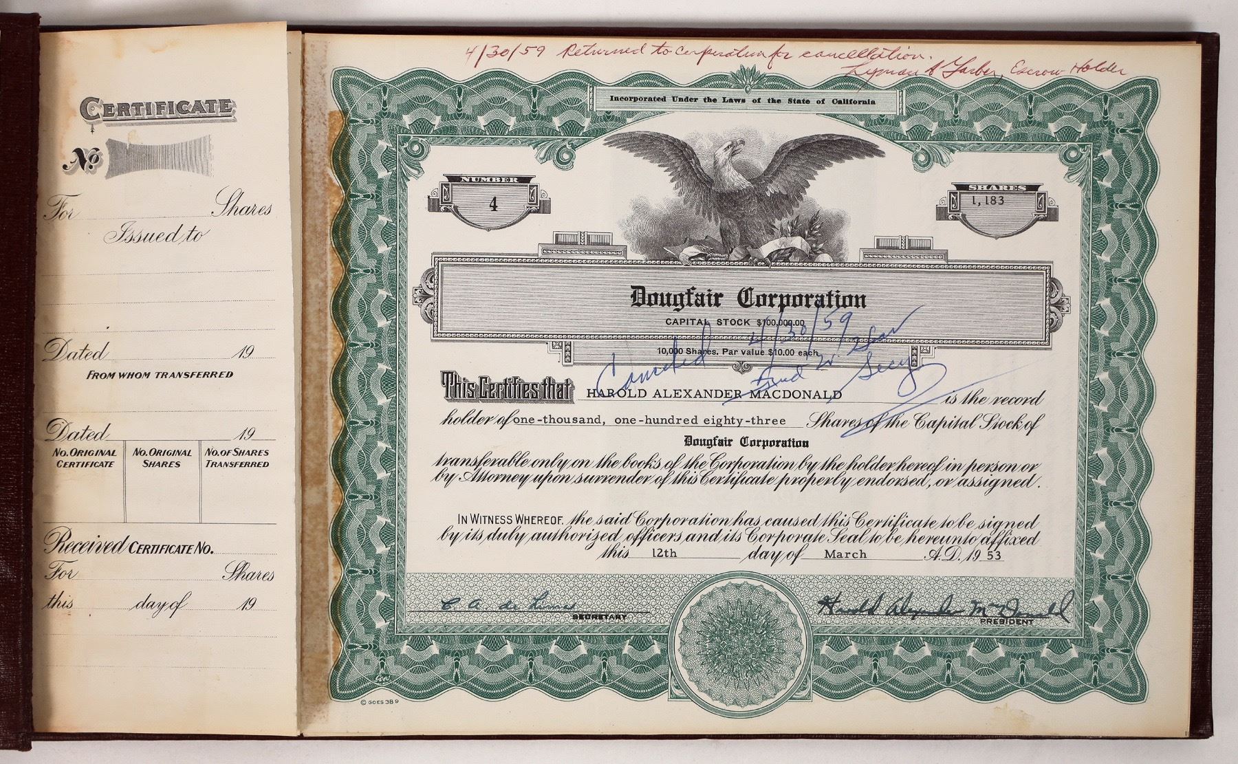 This stock book contains about 22 unissued certificates from The Dougfair Corporation, a television and film production company headed by actor Douglas Fairbanks Jr. Fairbanks, son of silent screen star Douglas Fairbanks Sr, formed the production company Dougfair in the early 1950s, producing anthology series like Rheingold Theatre, TV series like Terry and the Pirates and movies like Mr. Drake's Duck.