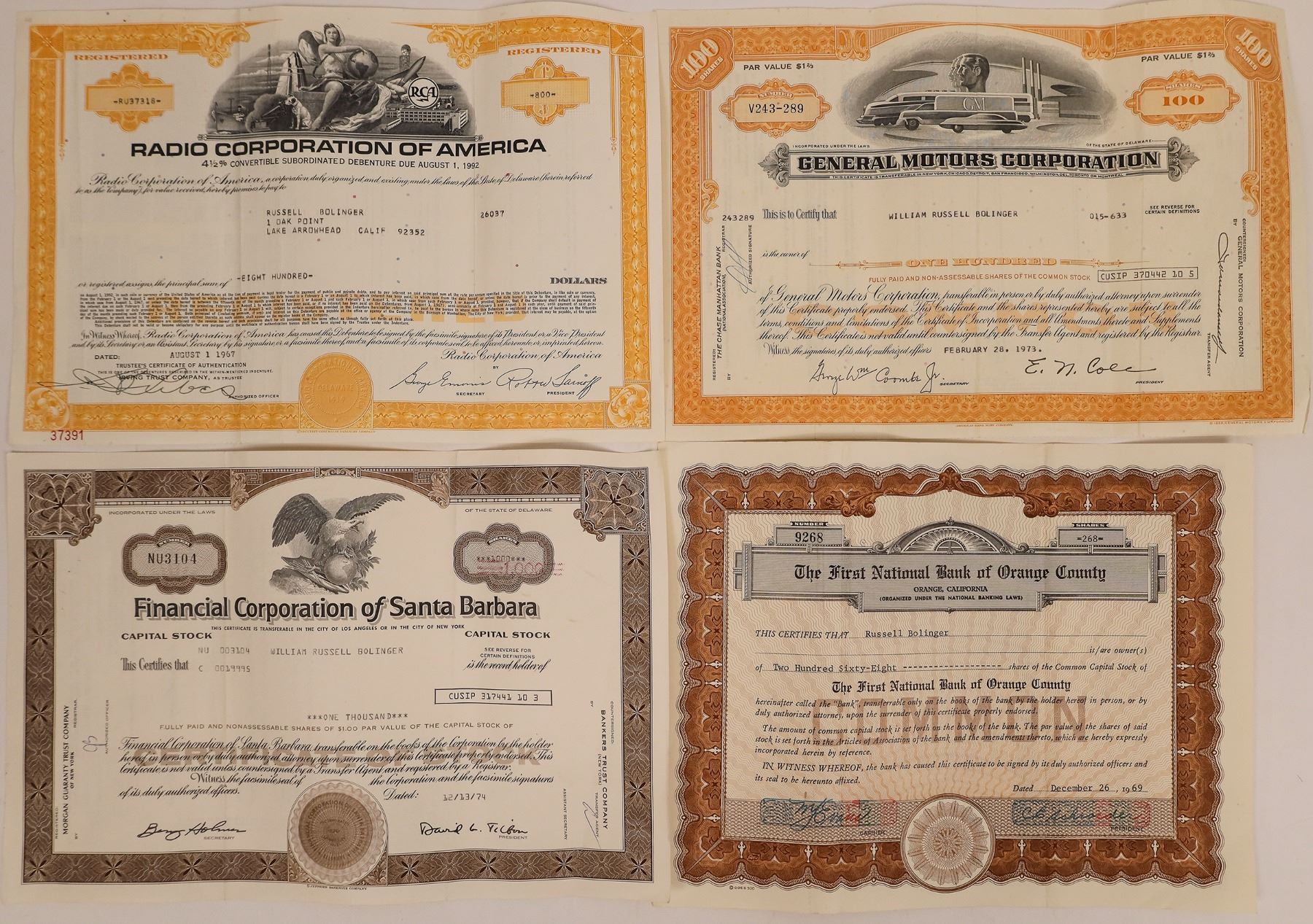 There is a stock certificate for RCA dated Aug., 1967 issued for $800; General Motors Corp. for 100 shares dated Feb., 1973 with Ed. Cole's named as President; The First National Bank of Orange County for 268 shares dated Dec., 1969; and 1000 shares of Financial Corporation of Santa Barbara dated Feb. ,1974 . All are issued stocks, uncancelled and considered antiques.