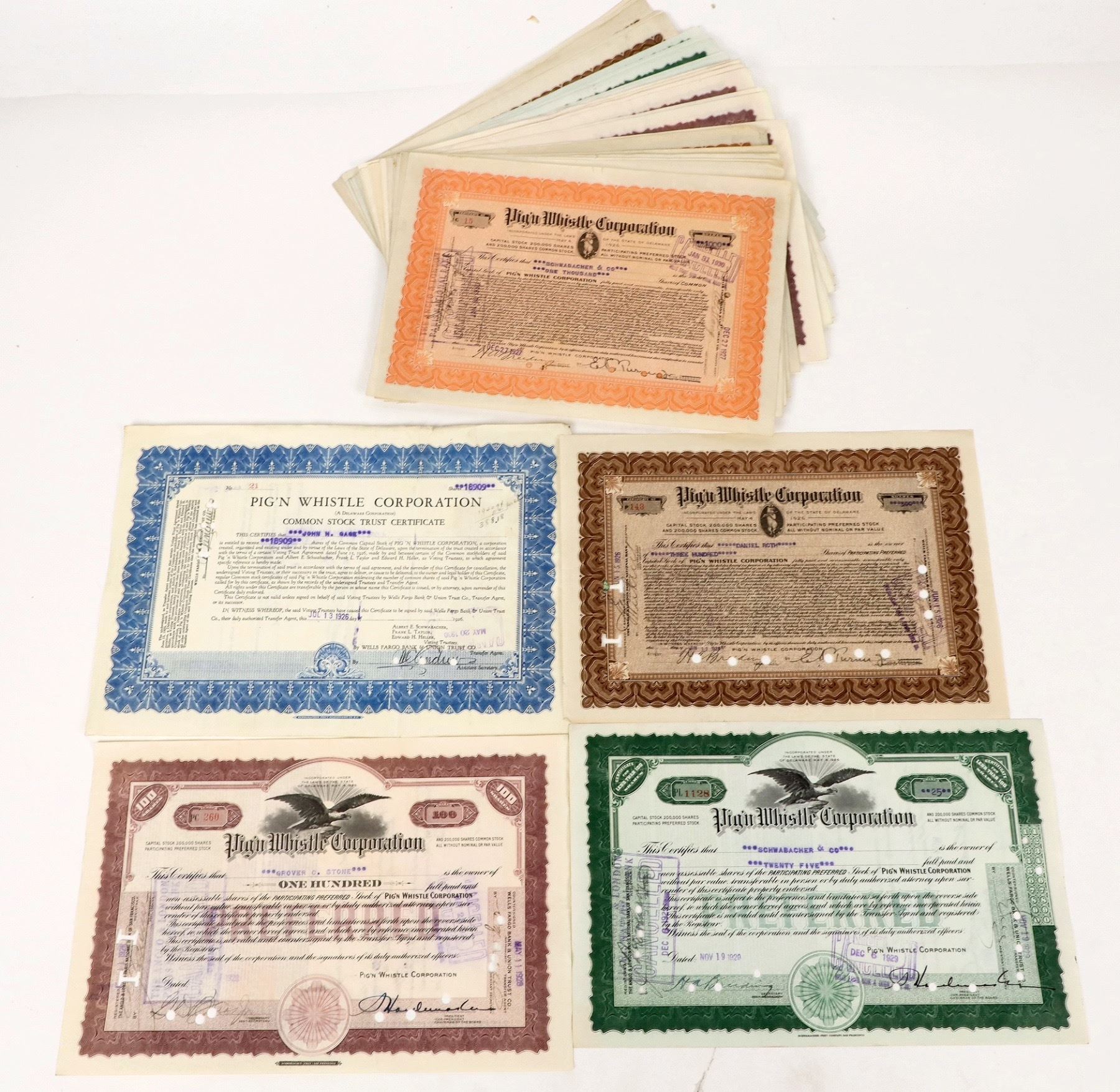 There are over 40 certificates for the Pig'n Whistle Corp. There is one blue cert., six orange certs., twelve purple certs., ten green certs. ,and nine brown certs. Please see photo for details.