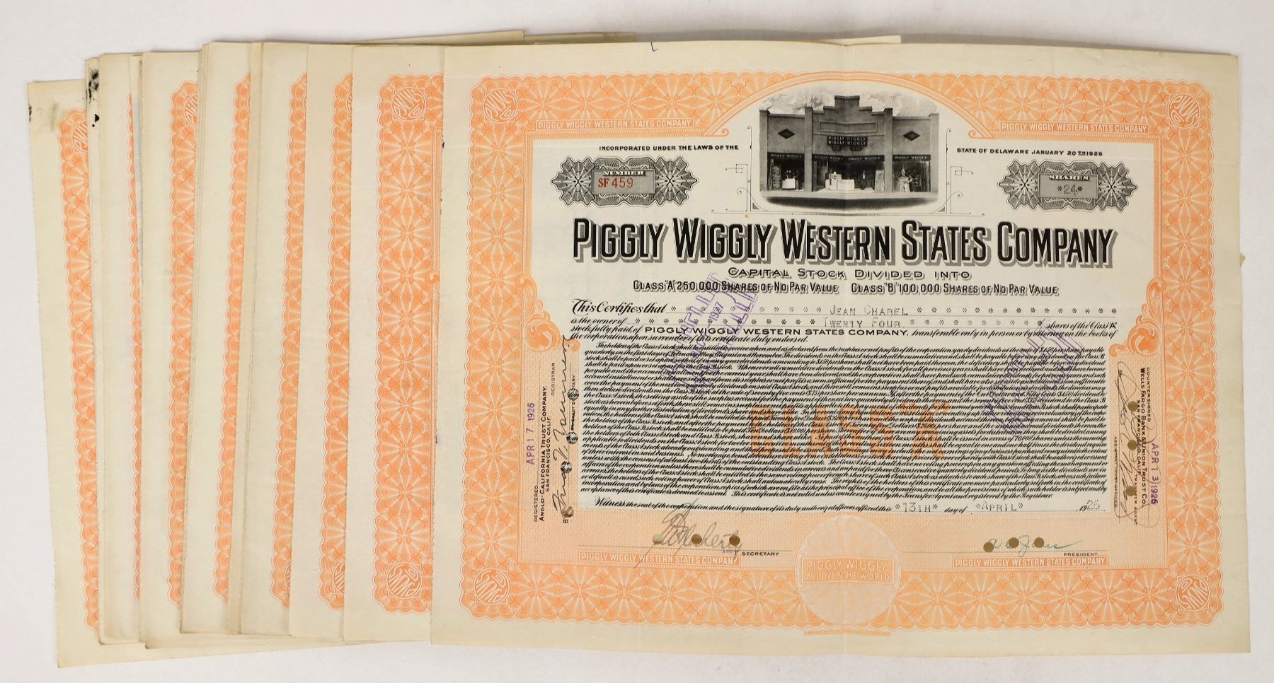 There are over 20 stock certificates for the Piggly Wiggly Western States Company. All are issued in 1926. Piggly Wiggly is known as the first self-service grocery store. Please see photo for details.