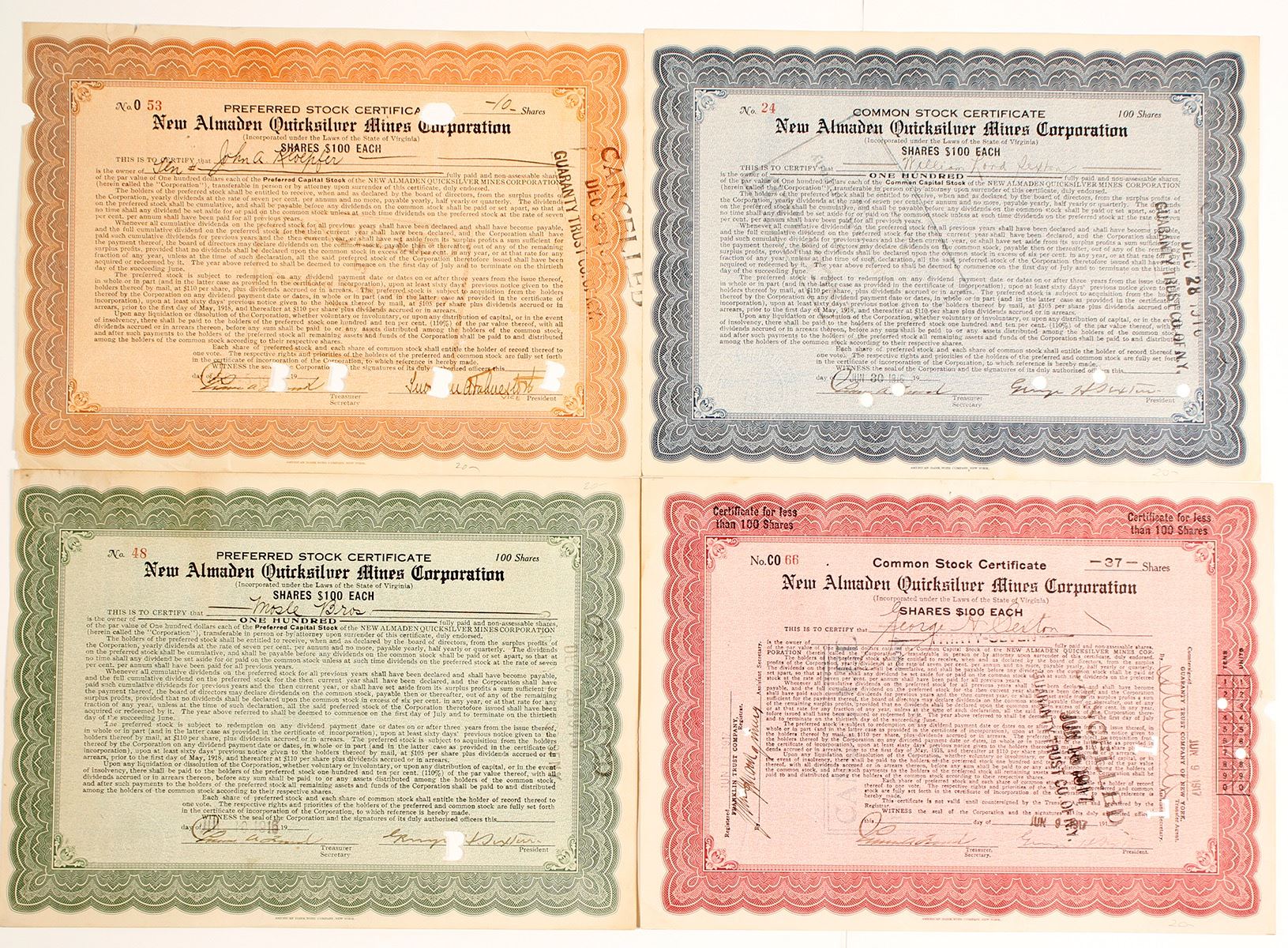 3 different New Almaden Quicksilver Mines Corp., I/punch cancelled, 10.5" x 7". Date: early 1900's Location: Alamaden, California HWAC# 63973
