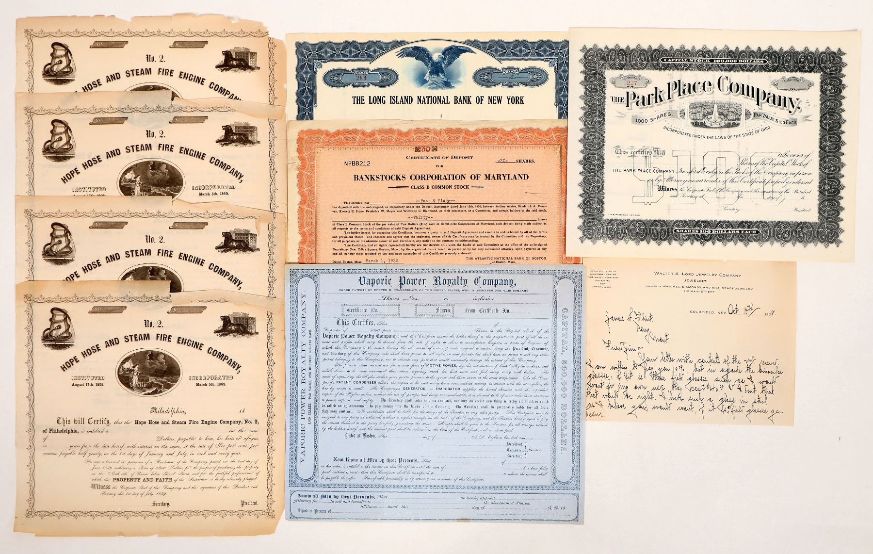 End of the day stock grab bag. Issued-1932 Bankstocks Corp. of Maryland, 1926 Long Island National Bank of NY. Unissued-Vaporic Power Royalty, Park Place Co., 4x Hope Hose and Steam Fire Engine Co. with edge issues. 2 misc. ephemera.