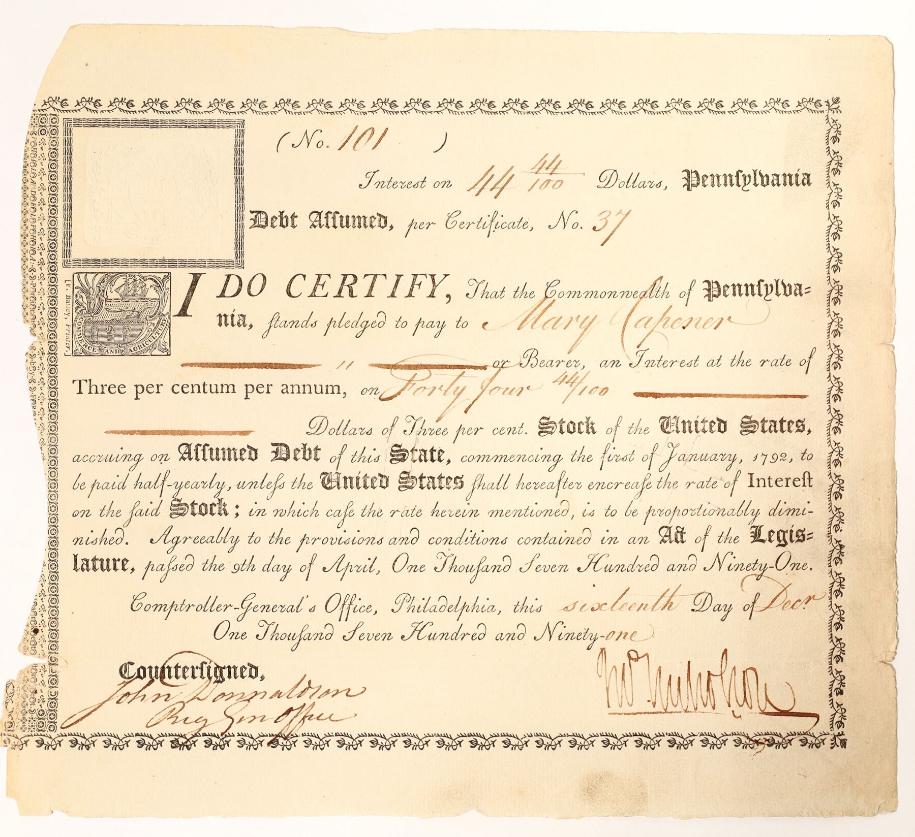 Very early. Certificate number 37 to Mary Capener for $44.44 stock of the United States accruing on assumed debt of this state commencing on 1 January 1792 to be paid half yearly unless the United States shall hereafter increase the rate of interest on said stock." December 16, 1791 signed by John Nicholson and John Donnaldson in the Brig. Gen.'s office. No information could be located about Capener.
