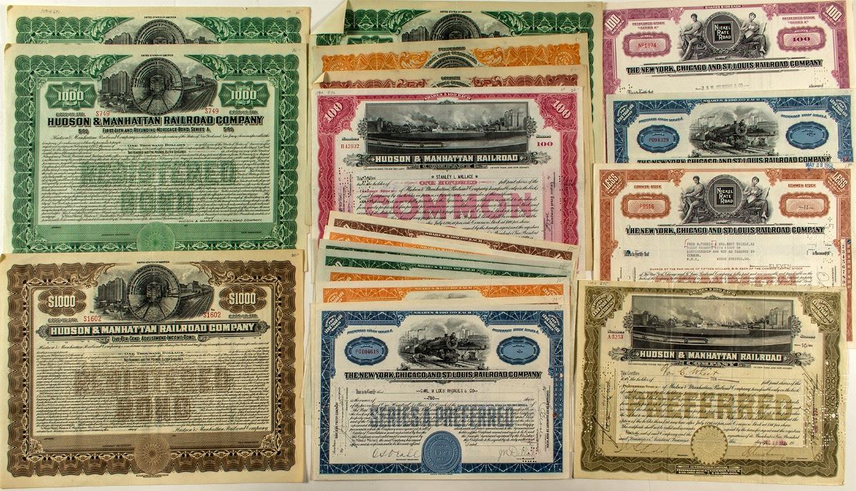 Lot of 19. Hudson & Manhattan Railroad Company: two unissued stocks, four unissued bonds, and two issued stocks: 1928 & 1947, both punch cancelled. One of two vignettes. From The New York, Chicago and St. Louis Railroad Company: eleven stocks, six different types. Issued 1947-1956, punch cancelled. (Prag Collection) City: State: New York Date: 1928-1956 hwac# 34433