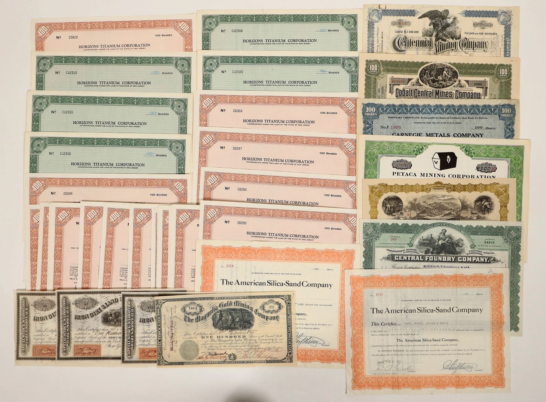Collection of 42 stock certificates related to U.S. companies that mine or process minerals, c1867-60s. All issued, 12 different, with 29 from Horizon Titanium Corp., 1959-61. Others include: Iron Dike & Land Reclamation Co., 1868, (3), with revenue stamps; Magnolia Gold Mining Co., 1882 (1); Centennial Mining Co., 1895 (1); Cobalt Central Mines Co., 1909 (1); etc.