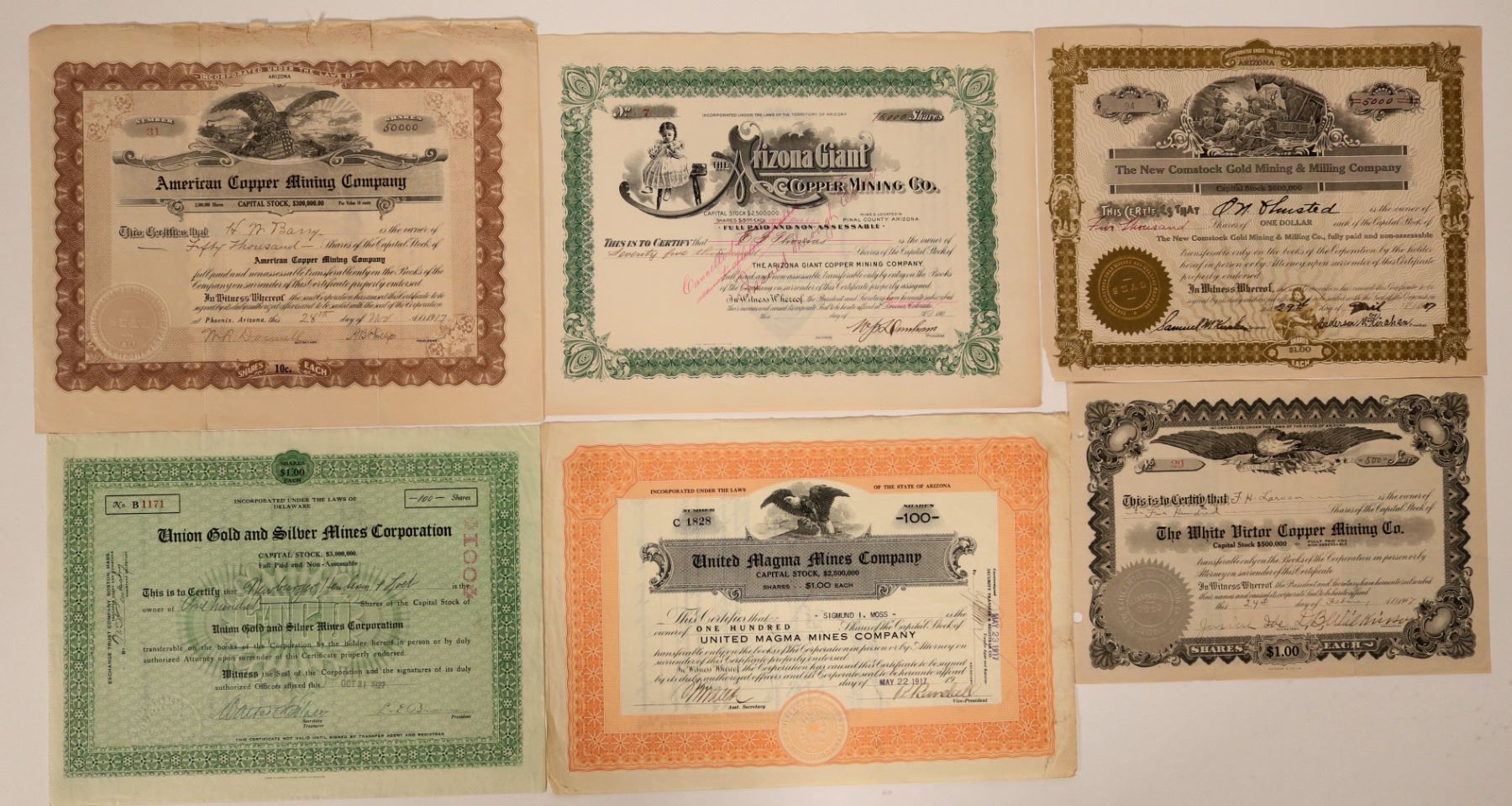 Lot of 6 different. These companies appear to have been all suspected of being fraudulent or a scam. Fun group. Included: White Victor Copper Mining Co. (1917, eagle vignette, under fraud investigation in 1918); New Comstock Gold Mining & Milling Company (1917, mining vignette, possible Nevada scam); United Magma Mines Company (1917, eagle vignette, owners convicted on mail fraud in 1919); Union Gold & Silver Mines Corp. (1927, fraud); Arizona Giant Copper Mining Co. (partially issued, child vignette, number 7, Pinal County, probable fraud); and American Copper MC (1917, eagle vignette, Tucson, indicted for fraud in 1918). Please inspect.