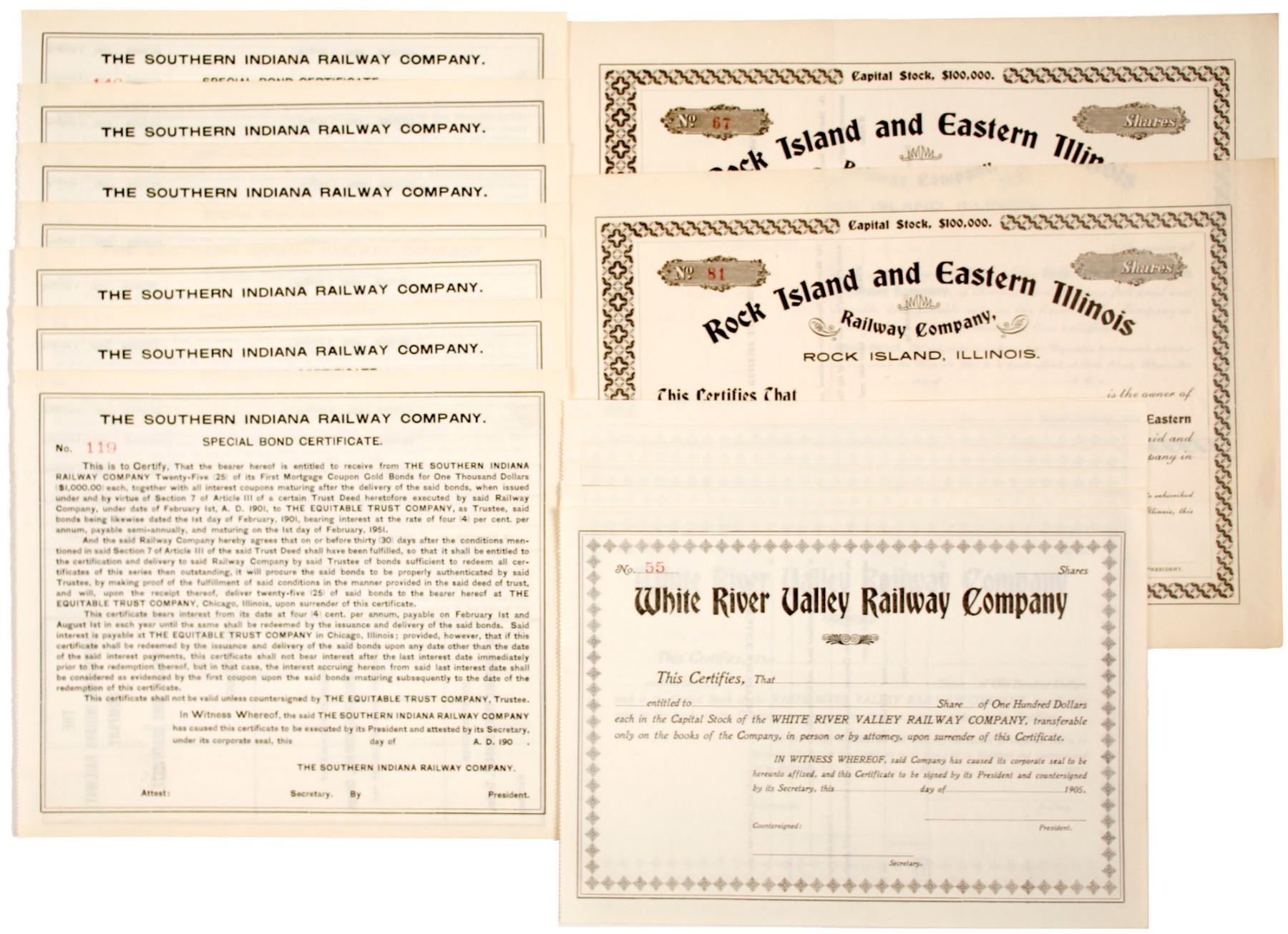 The Southern Indiana Railway Company shares are labeled as "Special Bond Certificate." They are unissued and have no date or signatures. In very good condition.