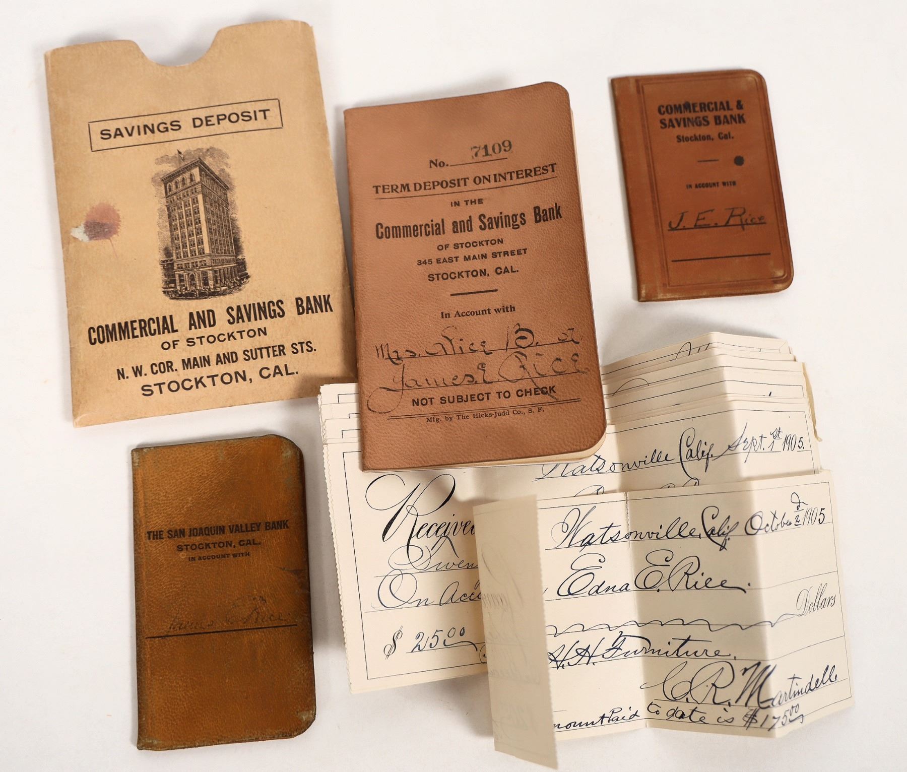 Three early 1900s Stockton California bank books and about six checks all from around the same time. All in nice condition. Please see photos for more details.