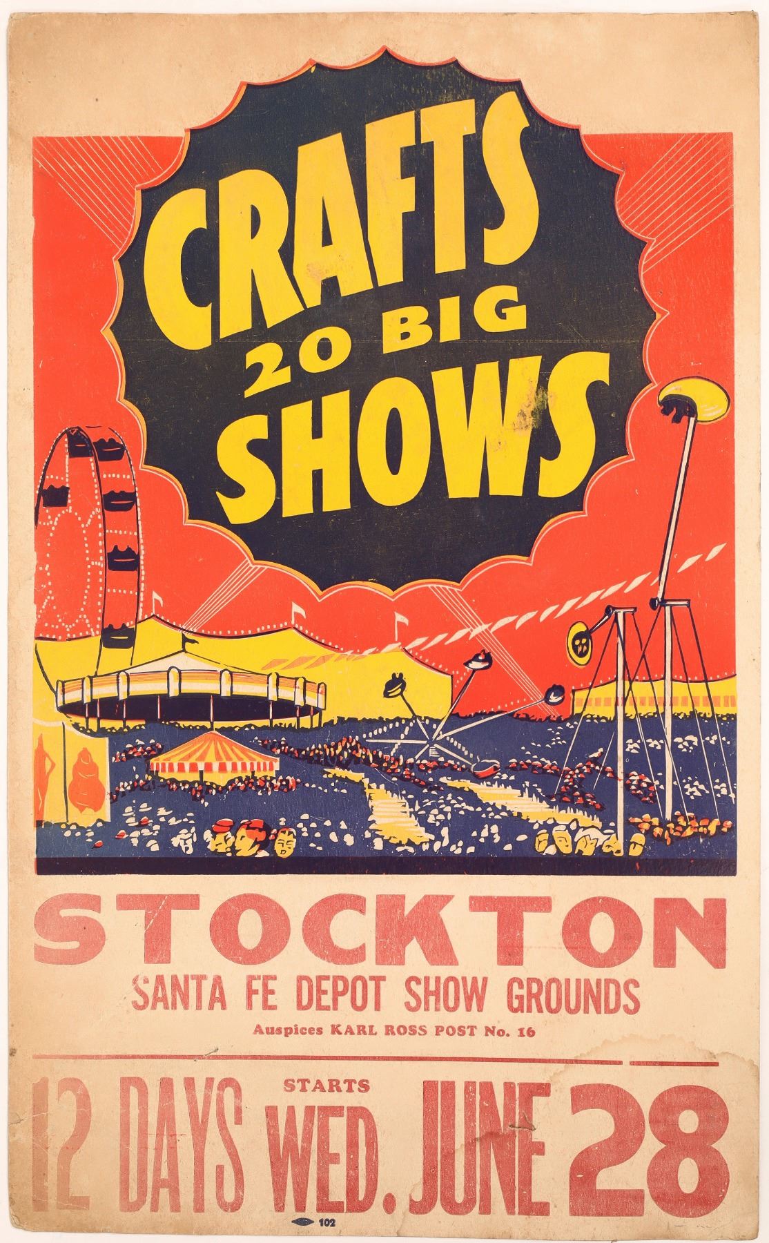 This poster depicts the Stockton (Ca.) circus by Crafts at the Santa Fe Depot Show Grounds. Auspices the Karl Ross Post #16 of the American Legion. 14 in. X 22 in. C. 1920's. Some water spotting on bottom edge see photos for details.