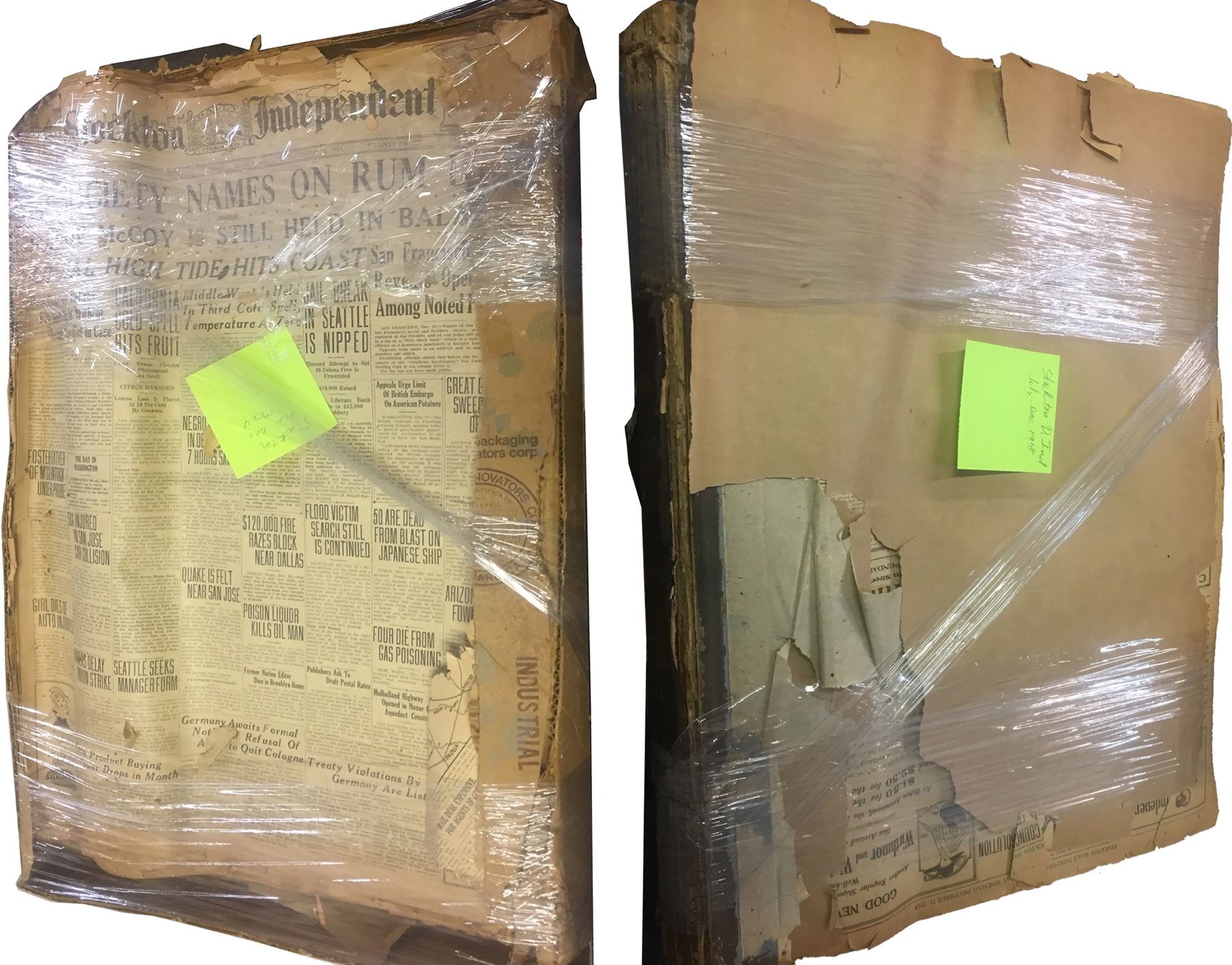 Two (once) bound volumes of the Stockton Independent. Jul-Dec. 1918, only one board, many loose, 18 x 23 x 4"; Oct-Dec 1924, partially bound, no boards, 23 x 17 x 2". These papers are made with high-acid pulp, thus are exceptionally brittle. the edges are tattered, as usual, and many papers on outside edges are fragmented. Fascinating issues can be found in virtually each volume of history. State: California City: Stockton Date: