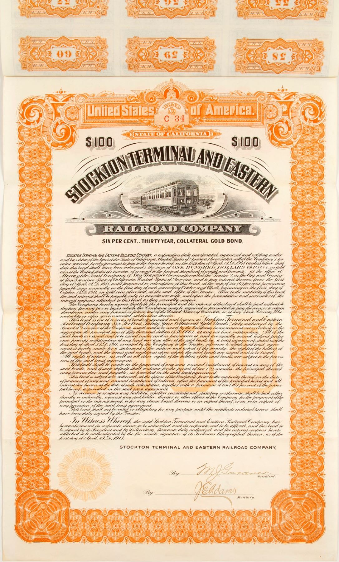 #34 $100 6% 30 year collateral gold bond signed by President Gardner. "Established in 1908, the Stockton Terminal and Eastern Railroad (reporting mark STE) provides service to several companies around the Stockton area, in San Joaquin County, California. It is a former Southern Pacific Transportation Company line." fromwikipedia. Prag Collection. State: City: Date: 1911 HWAC# 84140
