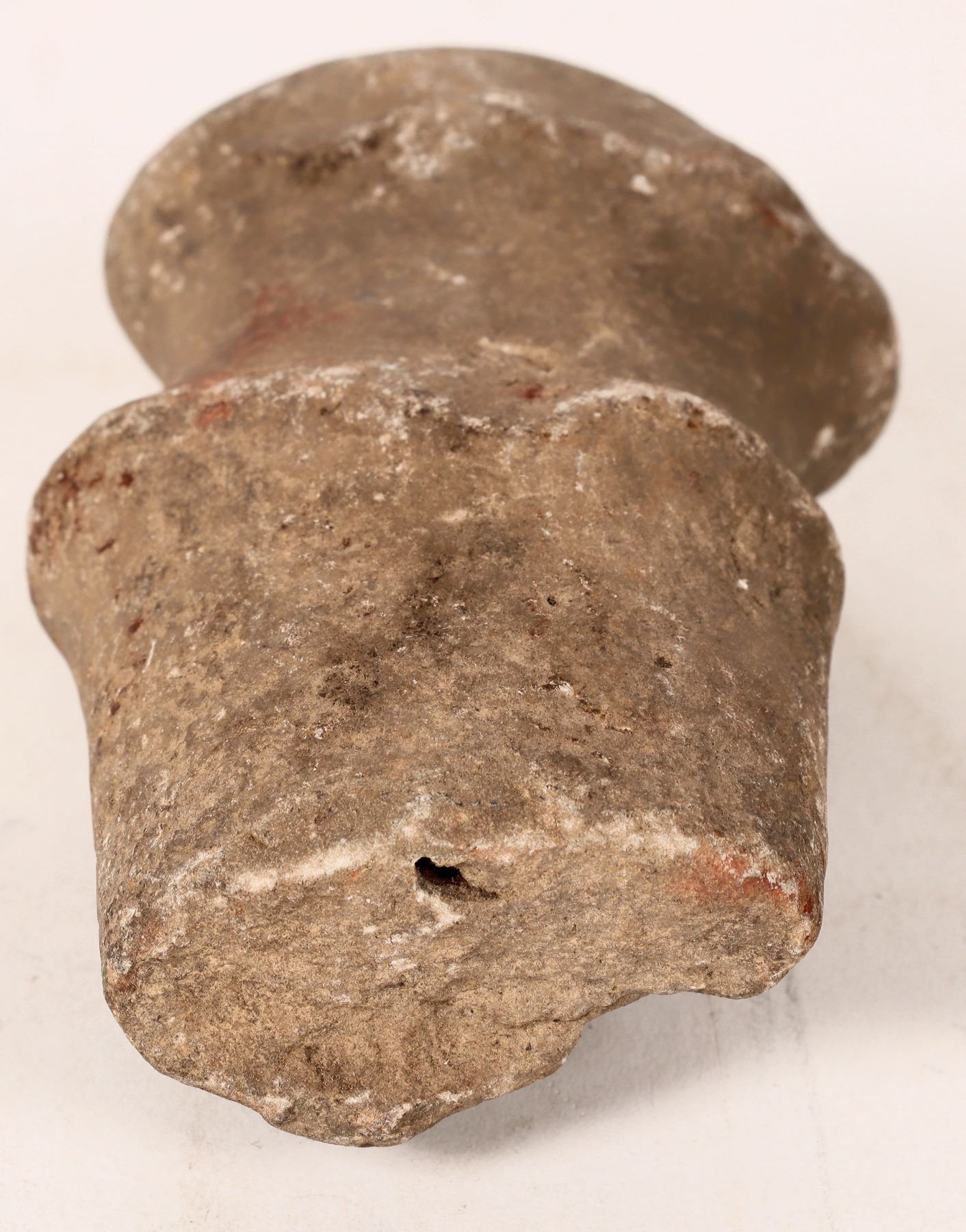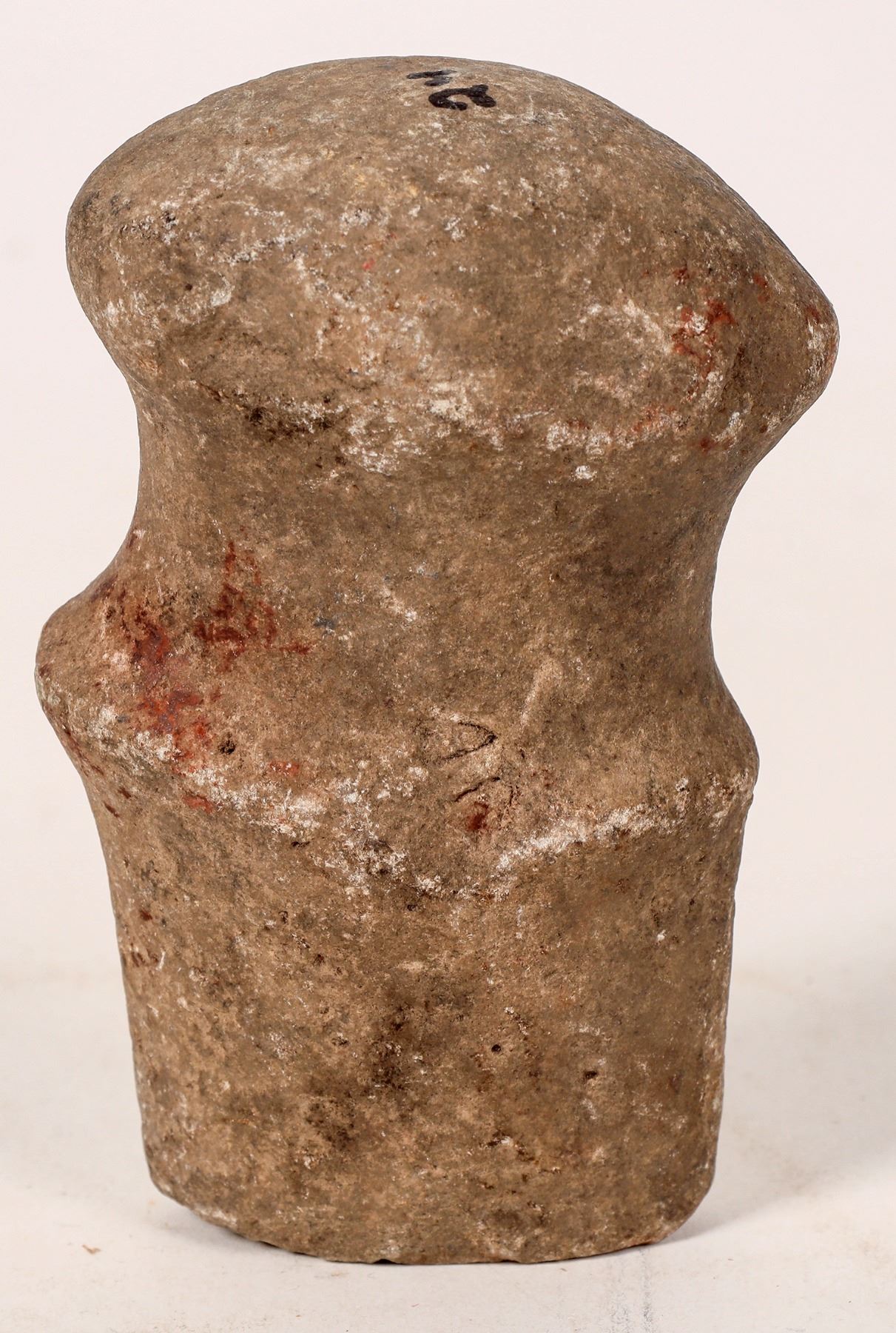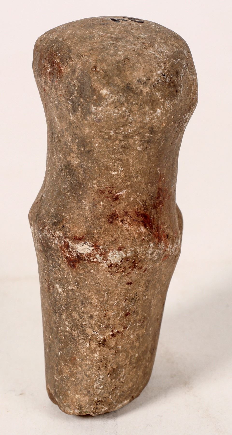 This stone axe has a rounded head, 360 degree groove and appears to have been broken off at 4 in. length. 13.8 oz. Marked "24" from a previous collection. From the Bracken collection. Please see photo for details.