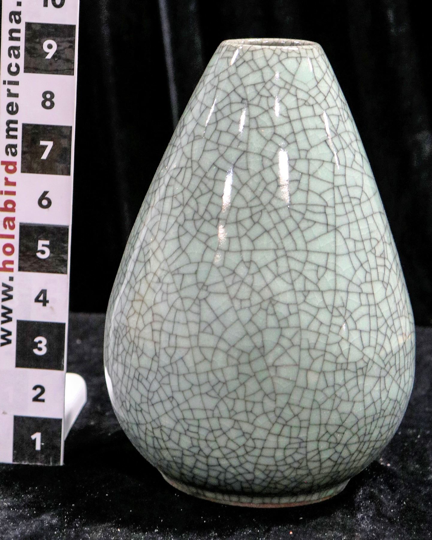 Crazed glaze celadon colored vase. Measures 6" diameter by 9" in height. China Chunlin Zhu Collection