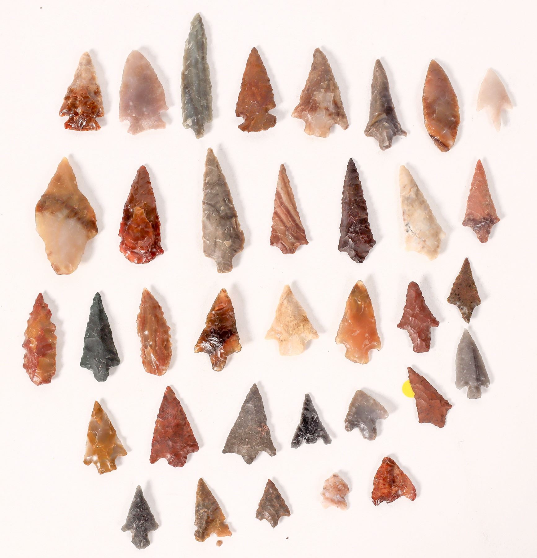 This lot holds 34 bird points from the Columbia River near present day Umatilla. There are a significant number of styles and colored materials used for these points. All are about 1.5 in. or smaller. This area has been occupied by Native Americans for thousands of years and would account for the variety of points displayed here. From the Bracken collection. Please see photos for details. Oregon