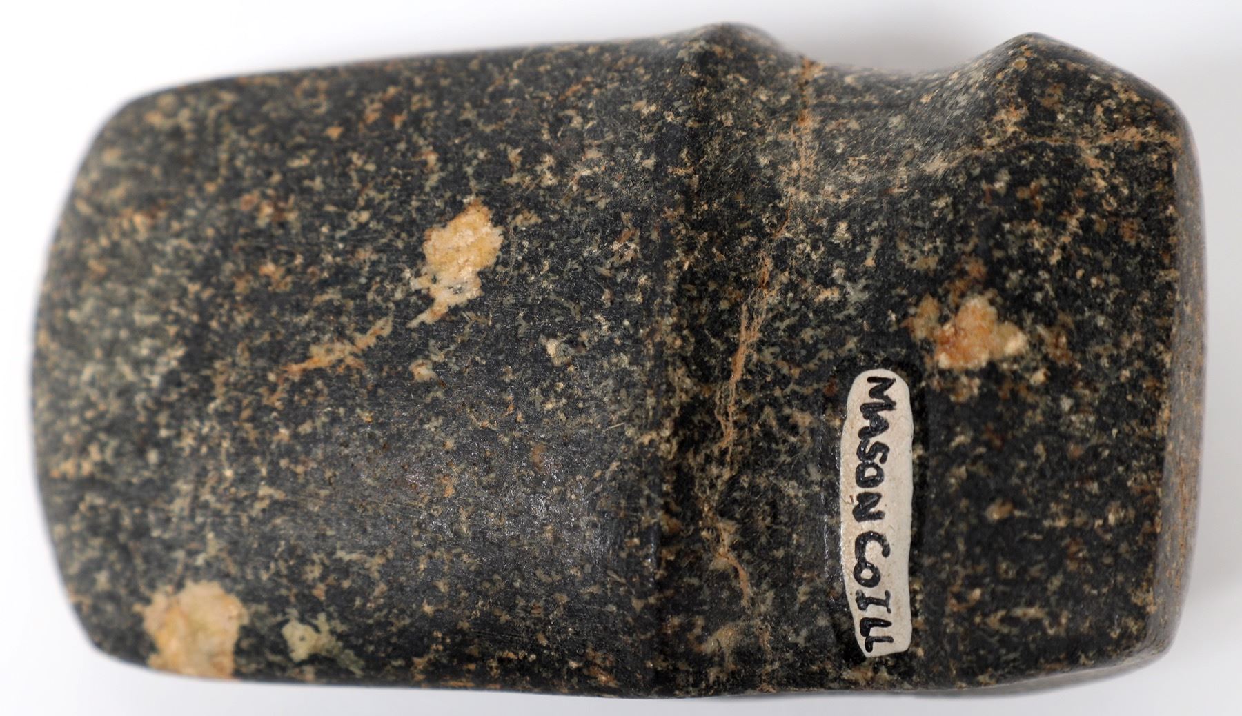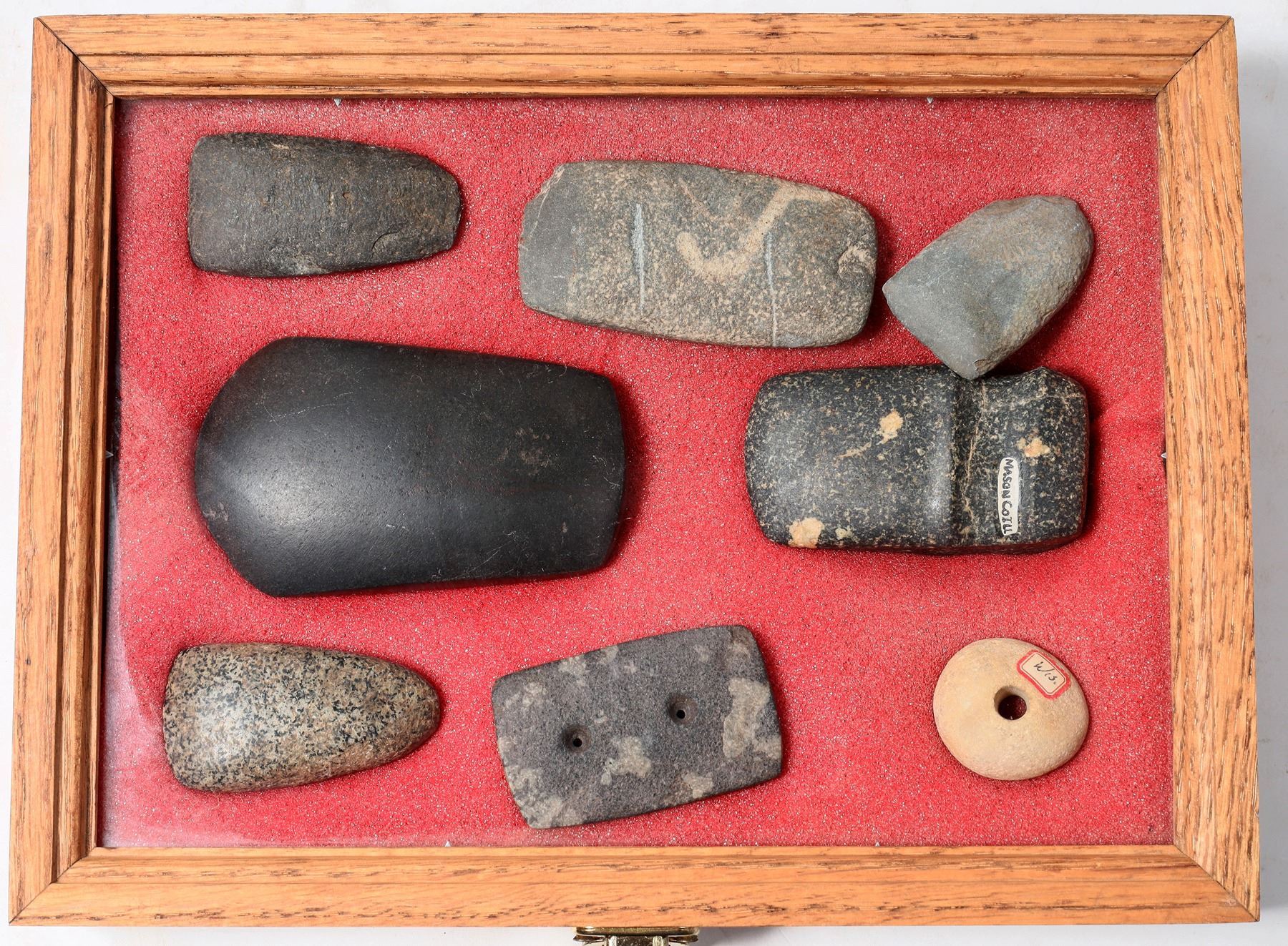 This lot has eight stone tools. The largest is a polished hematite stone 2.75 in./ 70 mm X 4.5 in./ 114 mm found in Burns Township, Shiawassee County, Michigan in 1901. There is an axe from Mason County, Illinois 3.5 in./ 89 mm X 2 in./ 51 mm. A flat stone with two drill holes cone tapered on both sides, 2.5in./ 64 mm X 2 in./ 51 mm. A disk with a center hole, no taper about 1.5 in./ 39 mm in diameter from Wisconsin. Other flat stones are from Illinois and Racine County, Wisconsin. From the Gary Bracken collection. Please see photos for details.