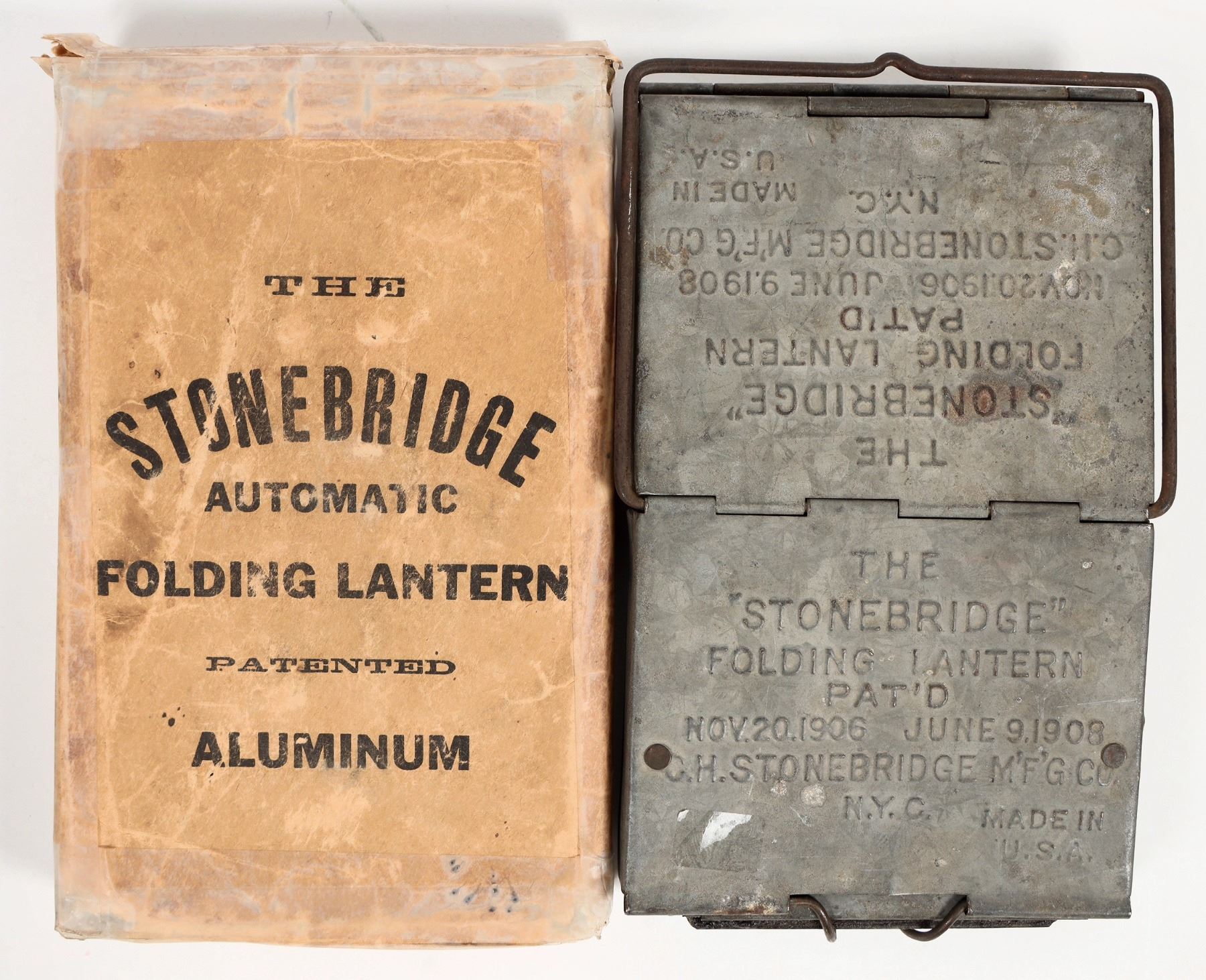 Stonebridge automatic Folding Lantern, pair. Rare w/box. Two lanterns, one original box. The box is in fair condition with edges protected by opaque clear tape. Each lantern measures 4.5x7x1.25" in collapsed state, 4x4.5x7" put together. The glass panes appear to be cracked/broken, but reinforced with packing tape. Please inspect photo.