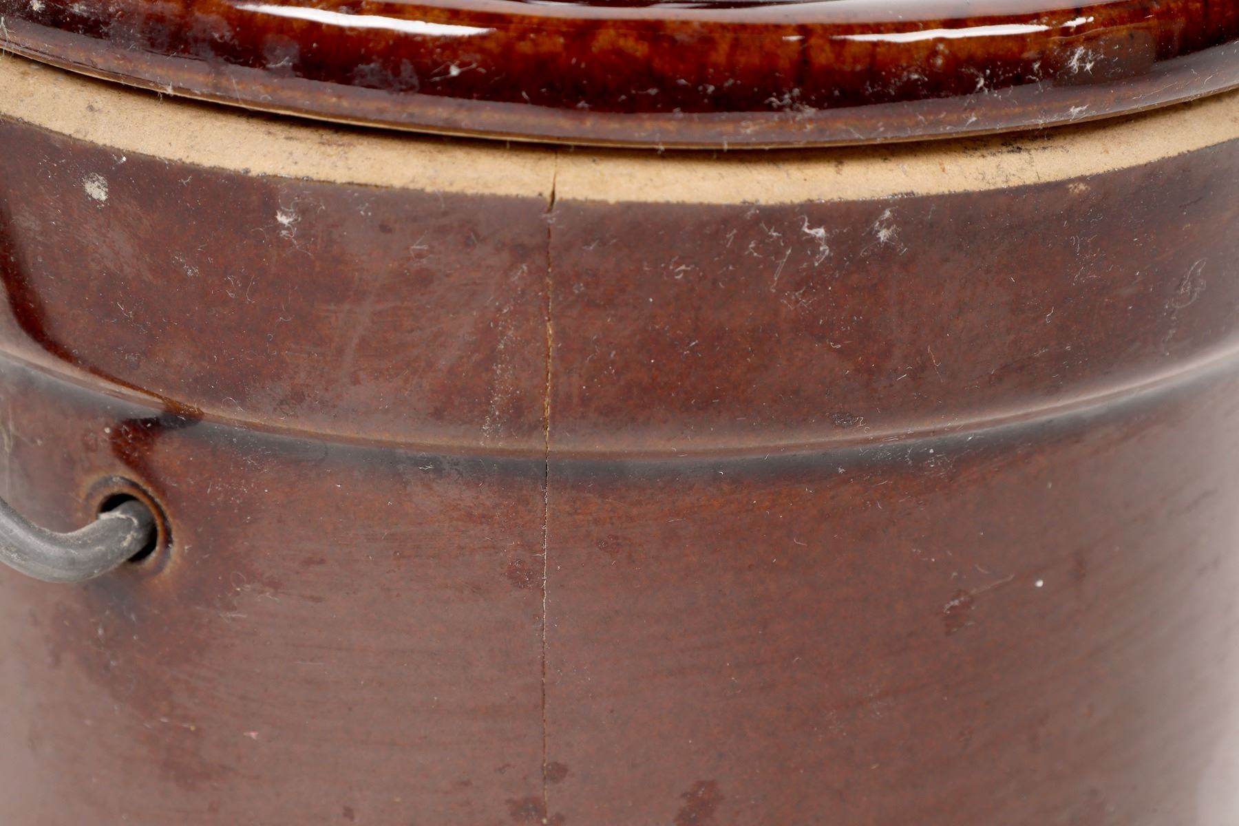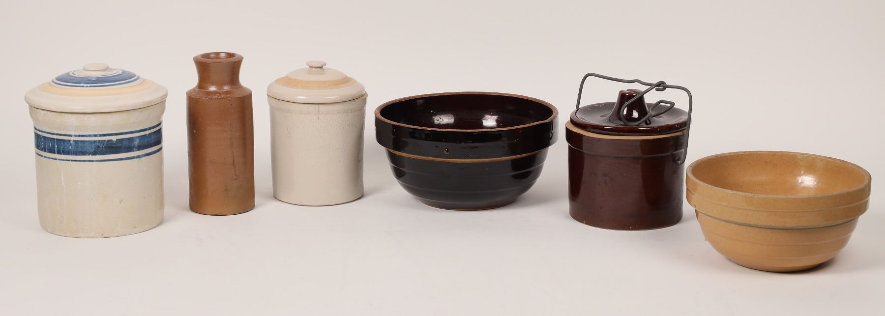 6 pieces of assorted stoneware. Bowls-Tan 8". Brown 9". Brown with lid and bale, 5.75" tall. Blue/white with lid, 7.25". Brown cylinder 7.25". Beige with lid, 6.5". No apparent chips or cracks.