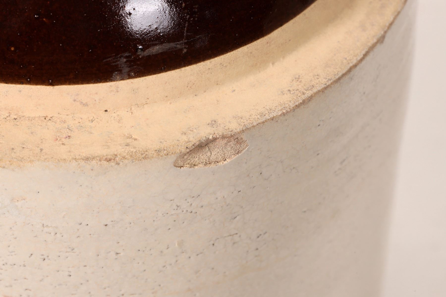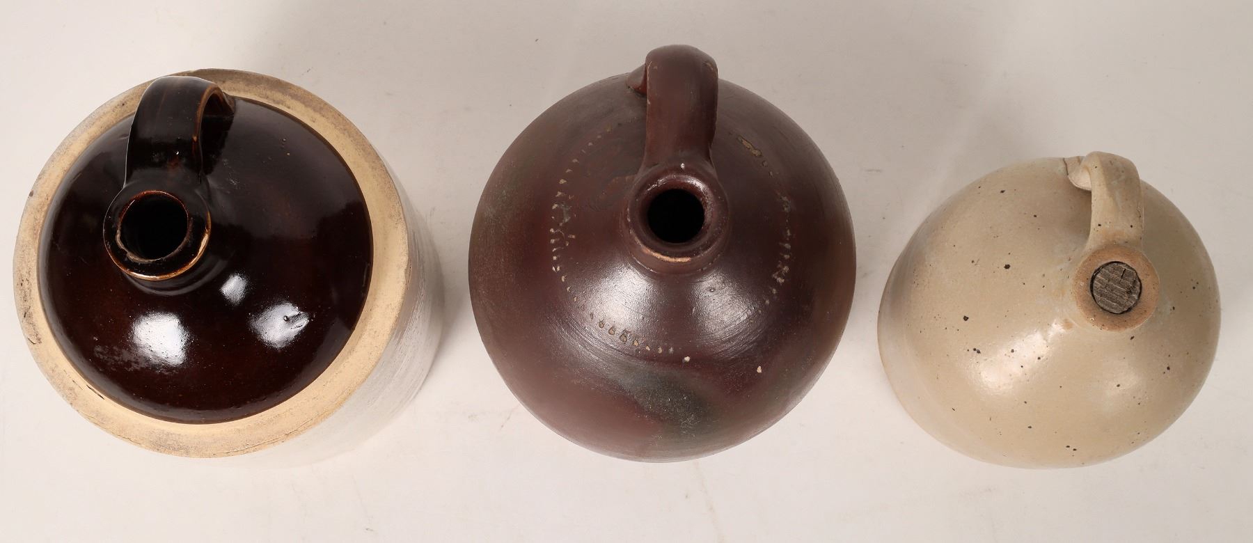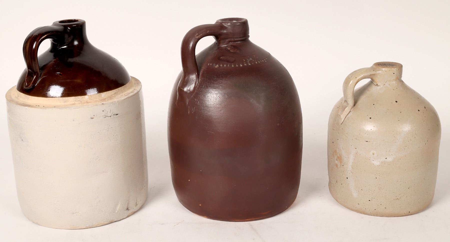 3 stoneware jugs, all unmarked. Brown 10.25", a few small chips. Brown 2 tone, 10.5". Beige 7.25".