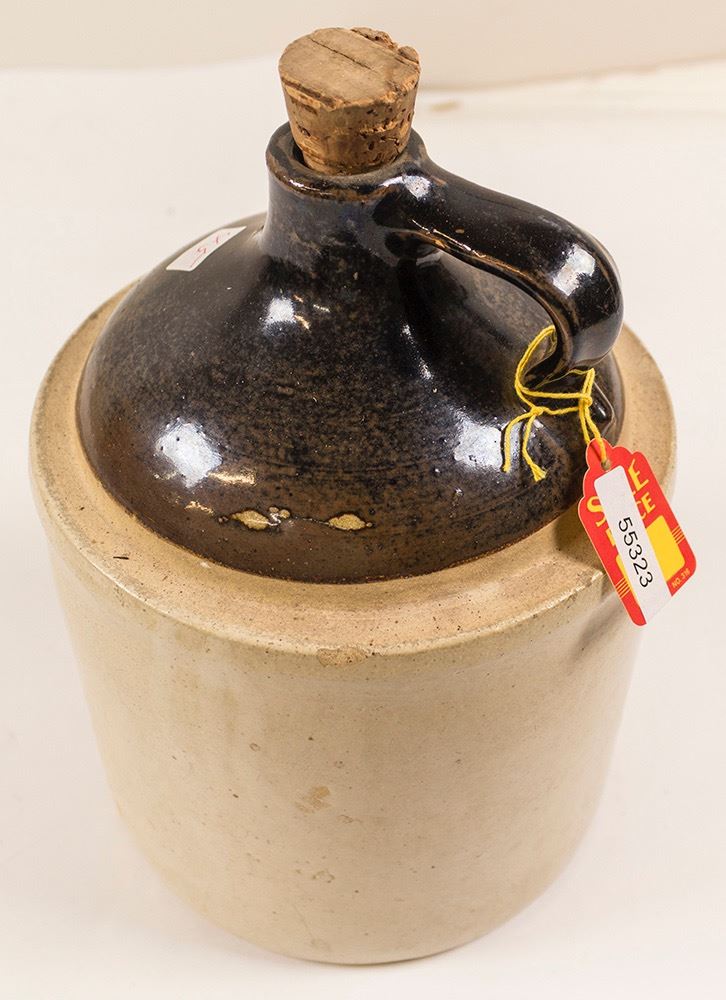 This whiskey jug is made by Harris Pottery. A wonderful rendition of an antique miner's whiskey jug from the gold rush era. Excellent condition, great for kitchen or den. Date: Location: HWAC # 55323