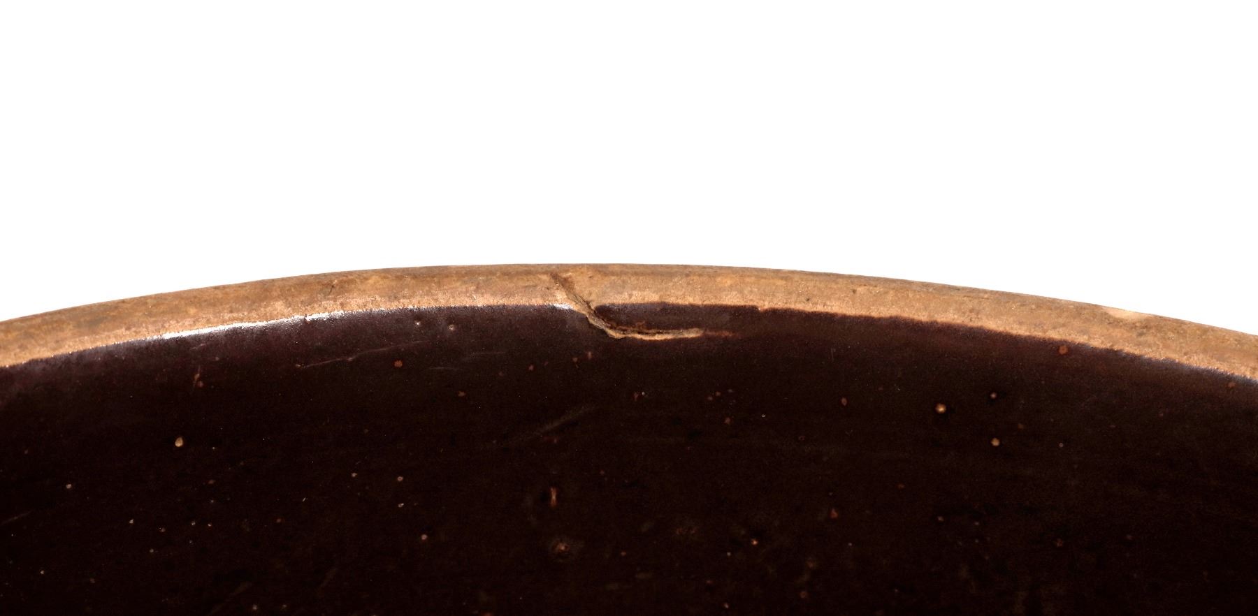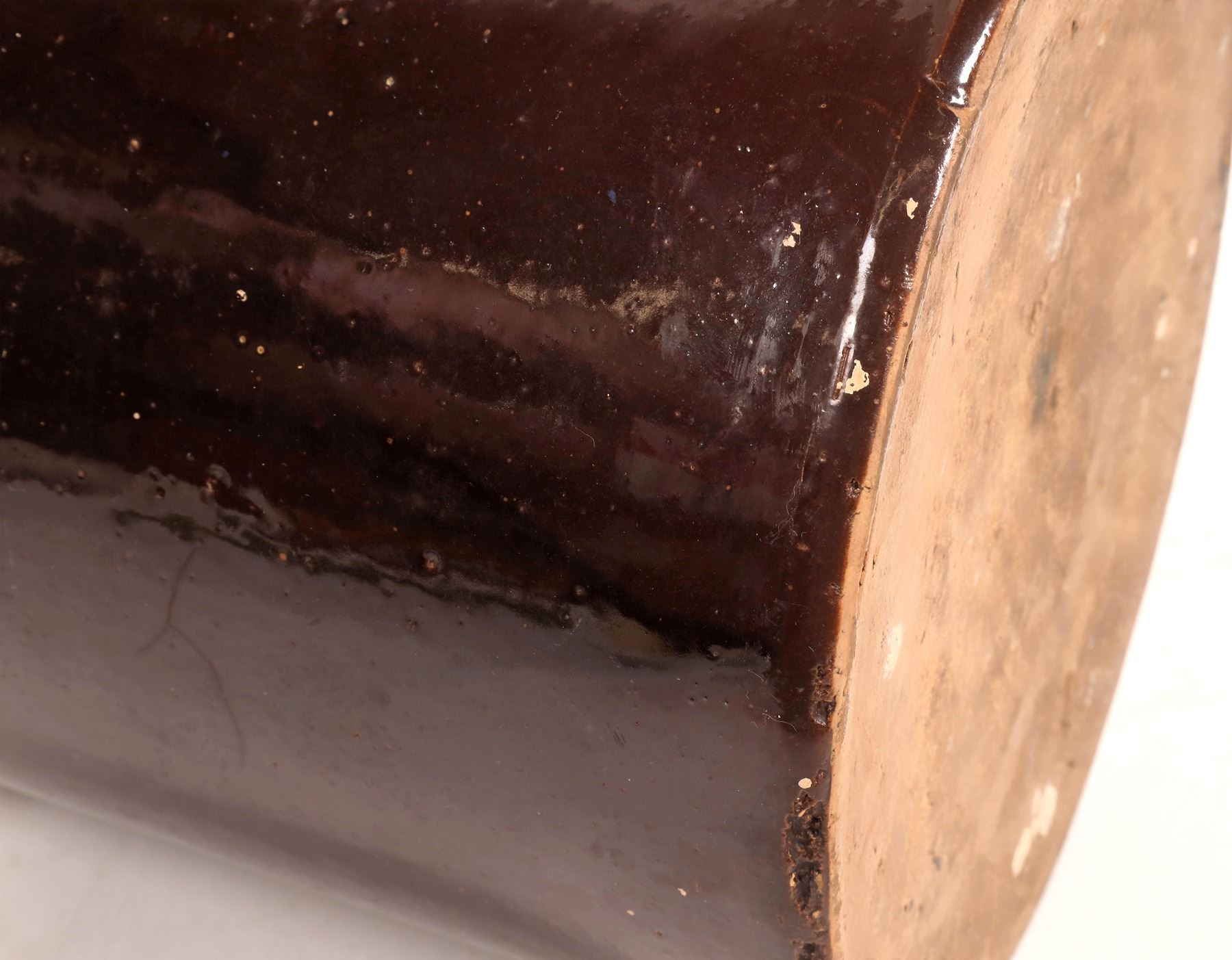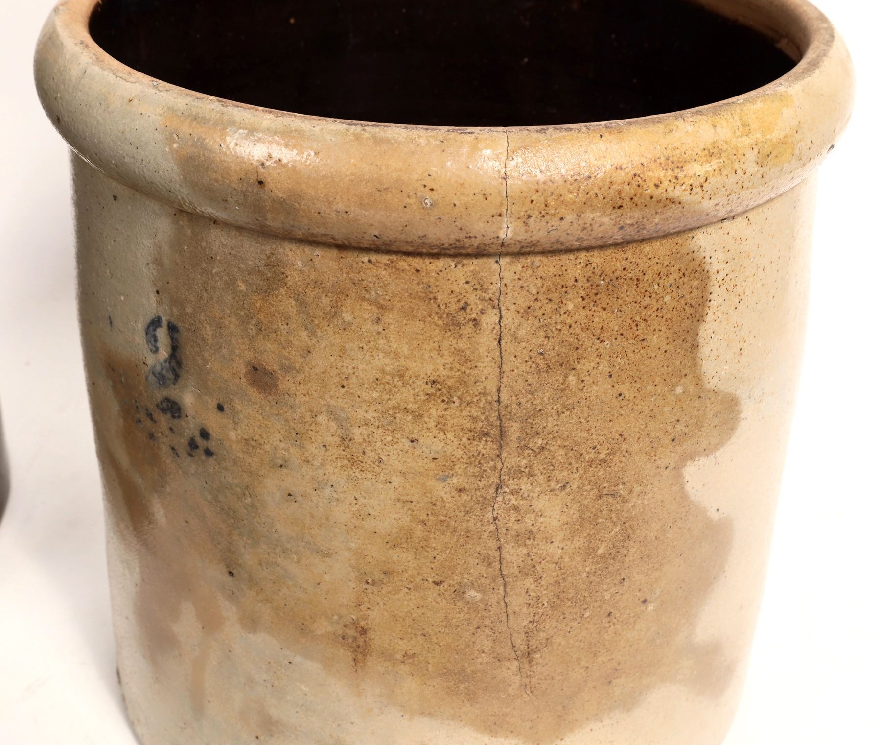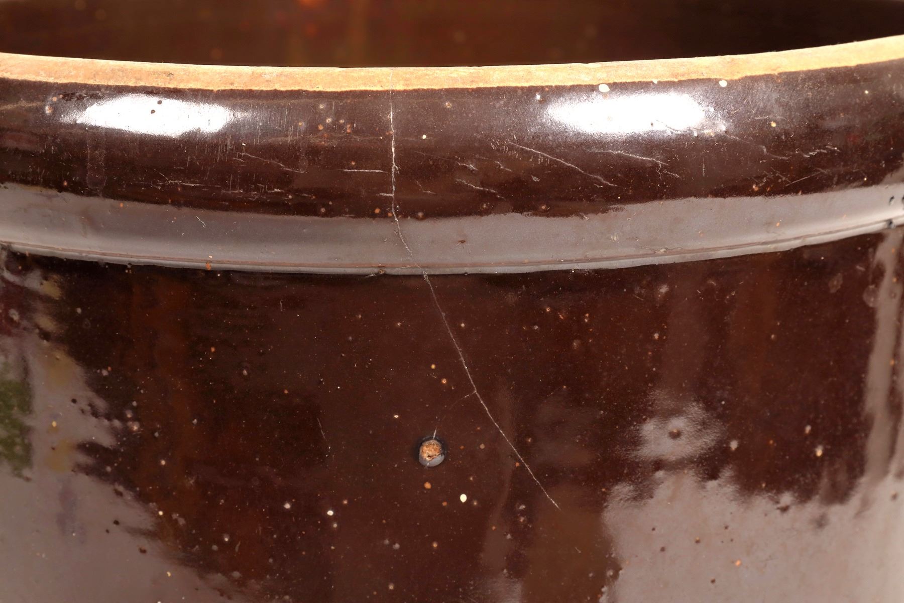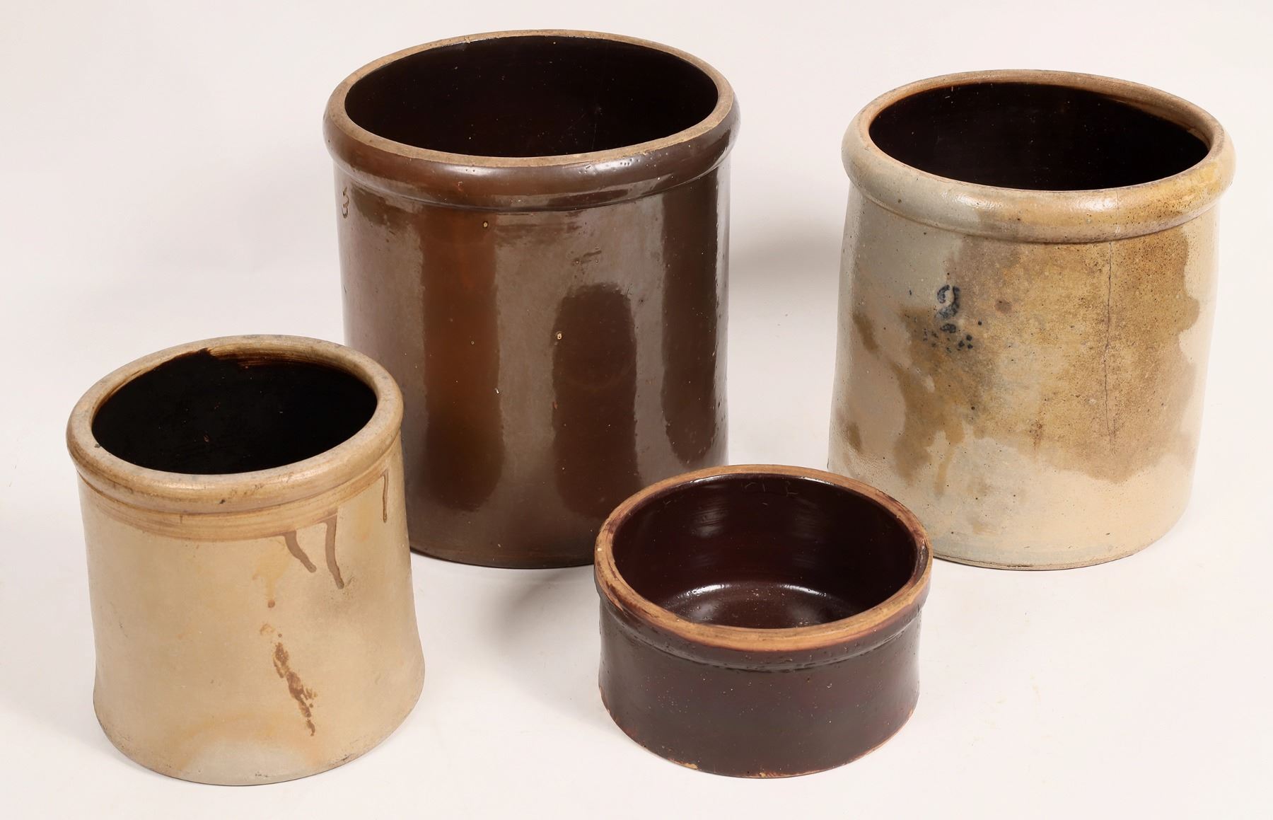 4 different unmarked stoneware pots. Brown 10.75x10.25" with a few dings. Sand colored 10x9.25" with 3" side crack. Beige 7x7". Brown 3.5x7.5", several small base chips. [Gary Bracken Collection] [