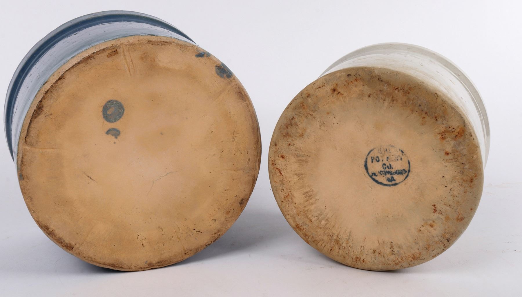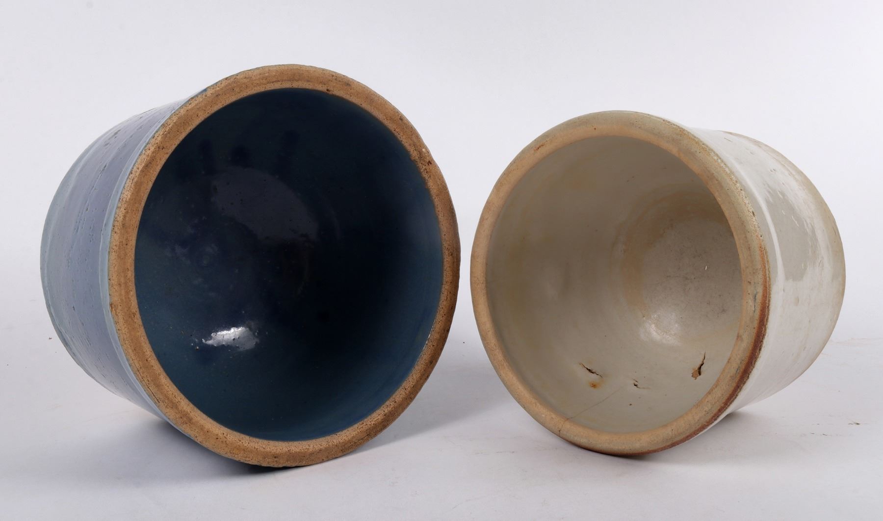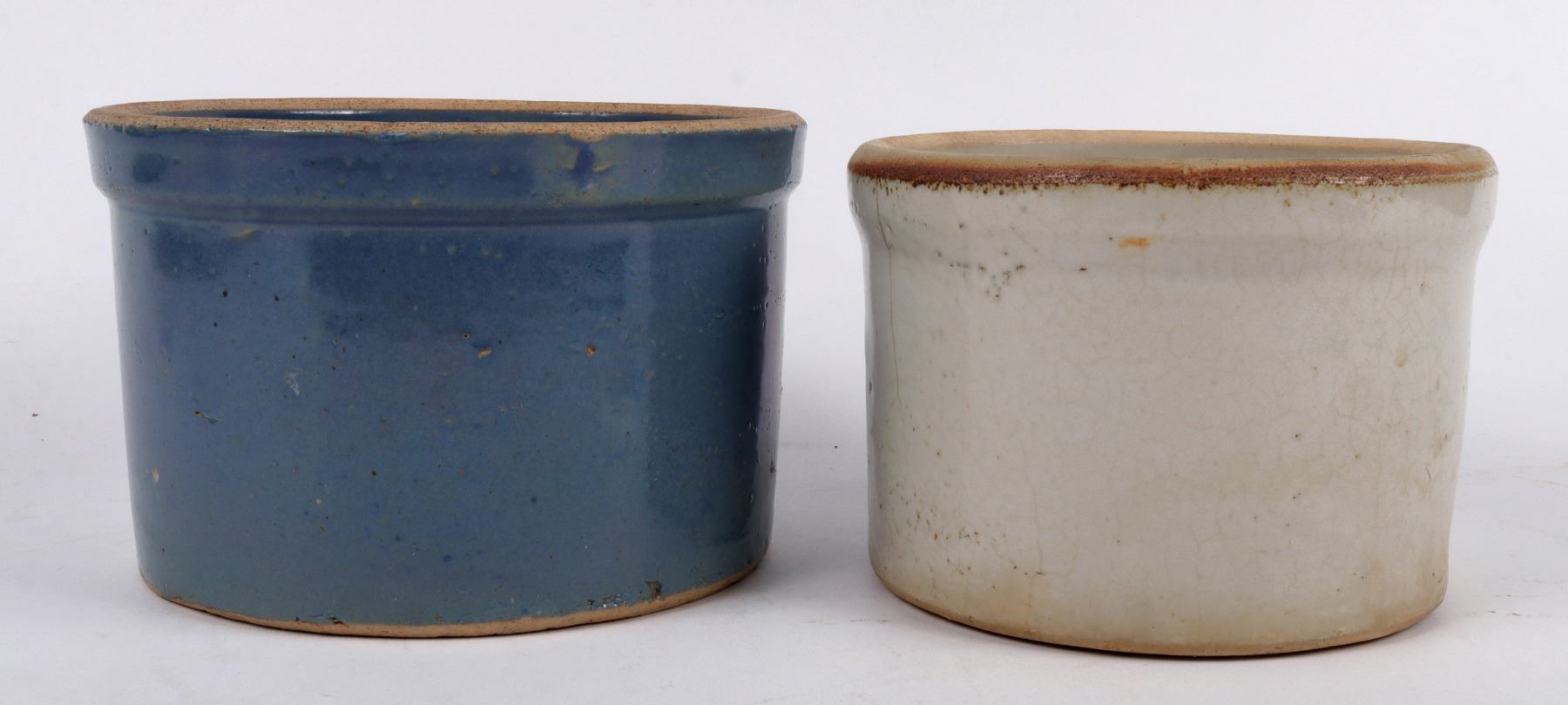 2 rounded bottom stoneware pots. Cream 4x5", marked The Pottery Co., 2.25" crack & 3 internal cracks. Blue 4x5.75"with lip ding. Gary Bracken Collection [Gary Bracken Collection] [