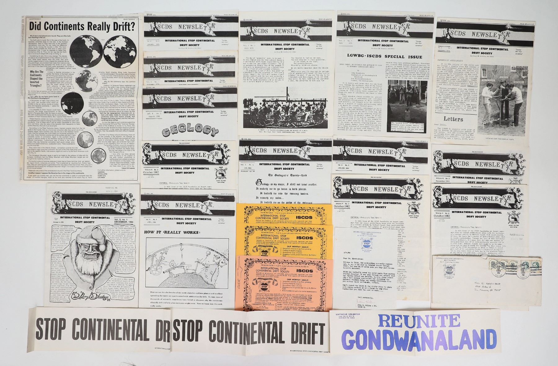 Newsletters (13) from the International Stop Continental Drift Society. This is a tongue-in-cheek organization fighting the impossible. They believe the sea floor is spreading, which is causing the continents to drift. Interesting reading. Please see photos for more details.