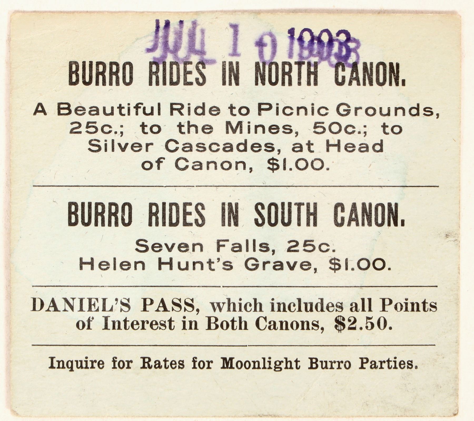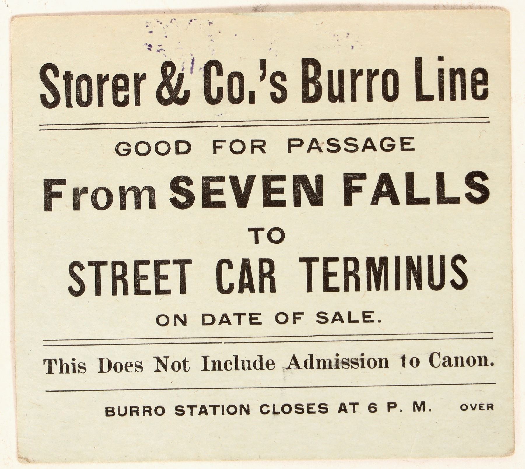 Rare Colorado token. Cardboard good for passage ticket, 2 3/4 inches square, light green. Obv.: Storer & Co.'s Burro Line / Good For Passage / From Seven Falls / To / Street Car Terminus / On date of sale / This does not include admission to Canon / Burro Station closes at 6 p.m. over. Rev.: Jul 10 1903 / Burro Rides in North Canon / A Beautiful Ride to Picnic Grounds / 25s; to the Mines, 50c; to / Silver Cascades, at Head / of Canon, $1.00/ Daniel's Pass, which includes all Points/ of Interest in Both Canons, $2.50 / Inquire for Rates for Moonlight Burro Parties.