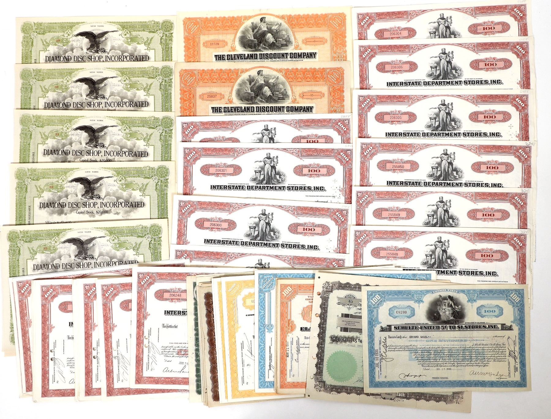 A group of approximately 80 stock certificates from various American stores, dating from 1922 to 1973. About half of the stocks are from Interstate Department Stores Inc. while the rest are from a variety of different companies, including dry goods stores, discount stores, and department stores. Almost all stock certificates are issued, and all are uncancelled. Most are signed by the secretary and president of their respective company, though some are signed by other individuals of importance (such as VP, treasurer, etc.) Generally good condition, some creasing and toning consistent with age.