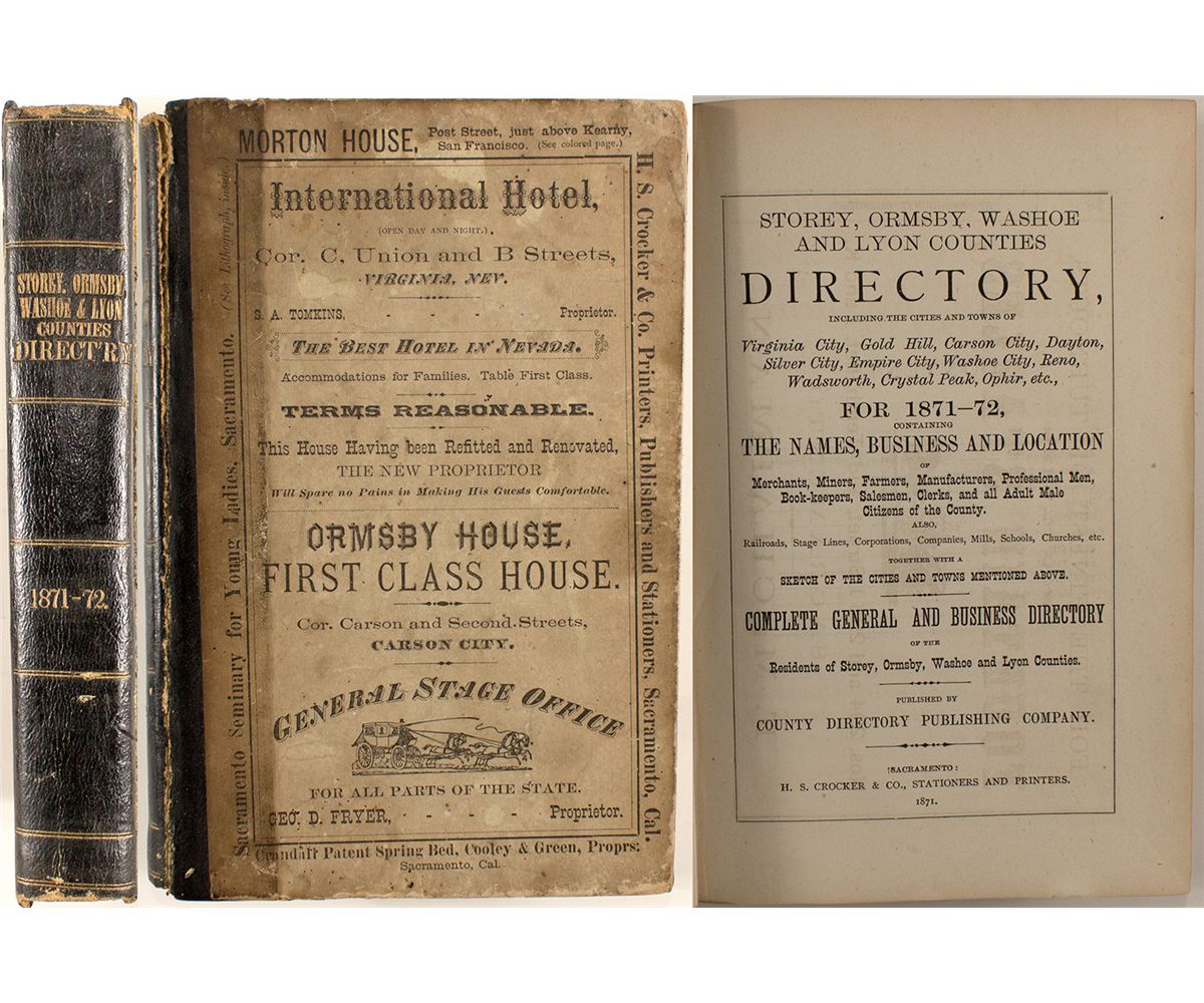 Quebedeaux 149. "extremely rare." Five copies listed as known. "Storey, Ormsby, Washoe & Lyon Counties Directory, Including the Cities and Towns of Virginia City, Gold Hill, Carson City, Dayton, Silver City, Empire City, Washoe City, Reno, Wadsworth, Crystal Peak, Ophir, etc., for 1871-72, Containing the Names, Business and Location of Merchants, Miners, Farmers, Manufacturers, Professional Men, Book-keepers, Salesmen, Clerks, and all Adult Male Citizens of the County. Also, Railroads, Stage Lines, Corporations, Companies, Mills, Schools, Churches, etc. Together with a Sketch of the Cities and Towns Mentioned Above. Complete General and Business Directory of the Residents of Storey, Ormsby, Washoe, and Lyon Counties. Published by County Directory Publishing Company. H.S. Crocker & Co., Stationers and Printers, 1871. 471 pp. Ads throughout on different colored paper.Organized by county, not city, and not alphabetically (Storey comes first). Virginia CIty has no separate business directory, but rather lists each resident with his job, but not necessarily the employer. Fantastic ads interspersed. Condition: front and back boards have begun to split from spine, but are still one piece. Some toning and soiling, though most pages are bright and clean, which is remarkable for a Western directory of this age.City: County: State: NVDate: