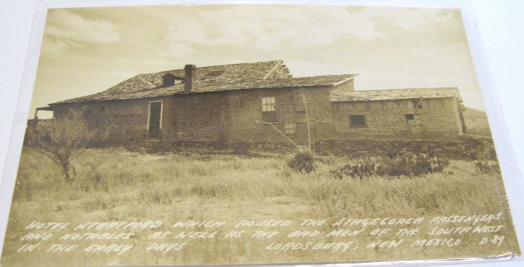 "Hotel Stratford which housed the stagecoach passengers and notables as well as the bad men of the southwest in the early days." D-89. The town proudly shares its heritage with such men as Billy the Kid, John Ringo, Curley Bill, Russian Bill, the Clantons, Jim Hughes and Sandy King! Unused. Date: Location: Shakespeare, New Mexico HWAC# 53973