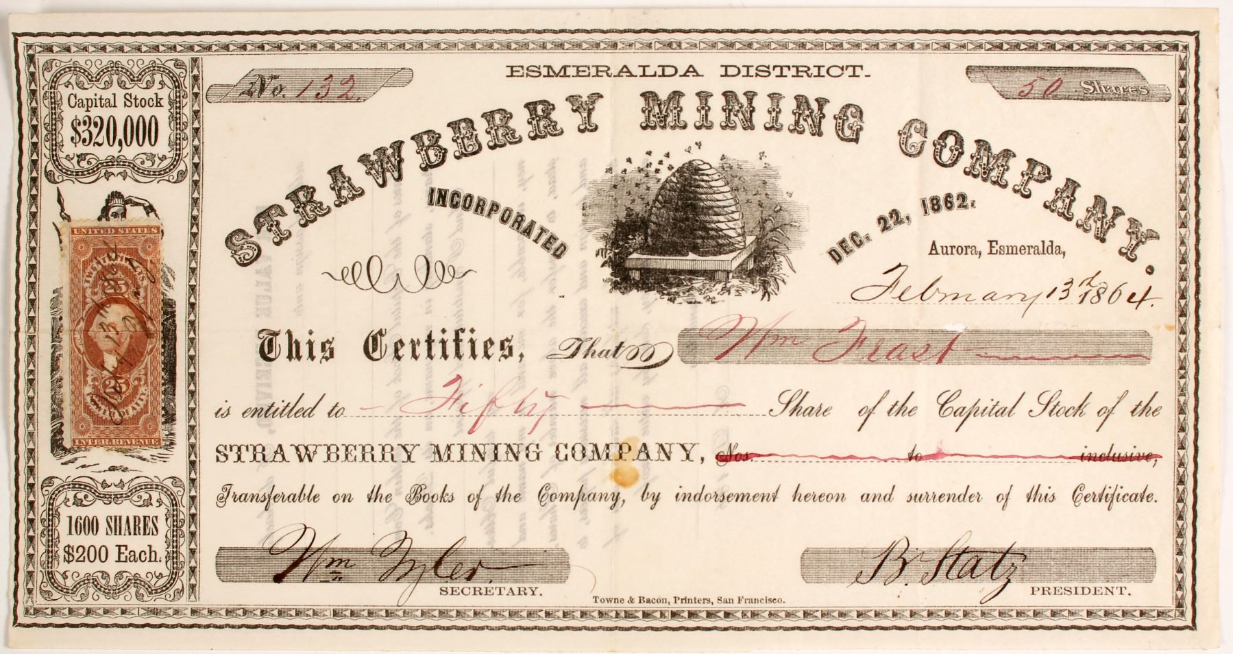 # 132 for 50 shares to William Feast.Signed by William Tyler and D Statz. Dateline 1864 Aurora. Incorporated December 22, 1862. Location Esmeralda District. Not cancelled. 25c Power of Att'y Revenue stamp. Not cancelled. Beehive vignette. Towne & Bacon printer, One small stain center. No edge or corner issues. Tyler was an original member of the Aurora Masons - incorporated in 1862. Bernard Statz lived on the north side of Wide West between Hall and Goodman (E64). William Feast was in Aurora by 1861. He owned a cabin on the northeast corner of Silver & Del Monte. He was the Mono County Treasurer and continued in this capacity after Aurora was proven to be in Nevada. Feast was also the secretary of the West Wind, Fairy Queen, Utah and Gibraltar. He died in Aurora in 1864. Prag Collection State: Nevada City: Aurora Date: 1862 (1864) HWAC# 82008