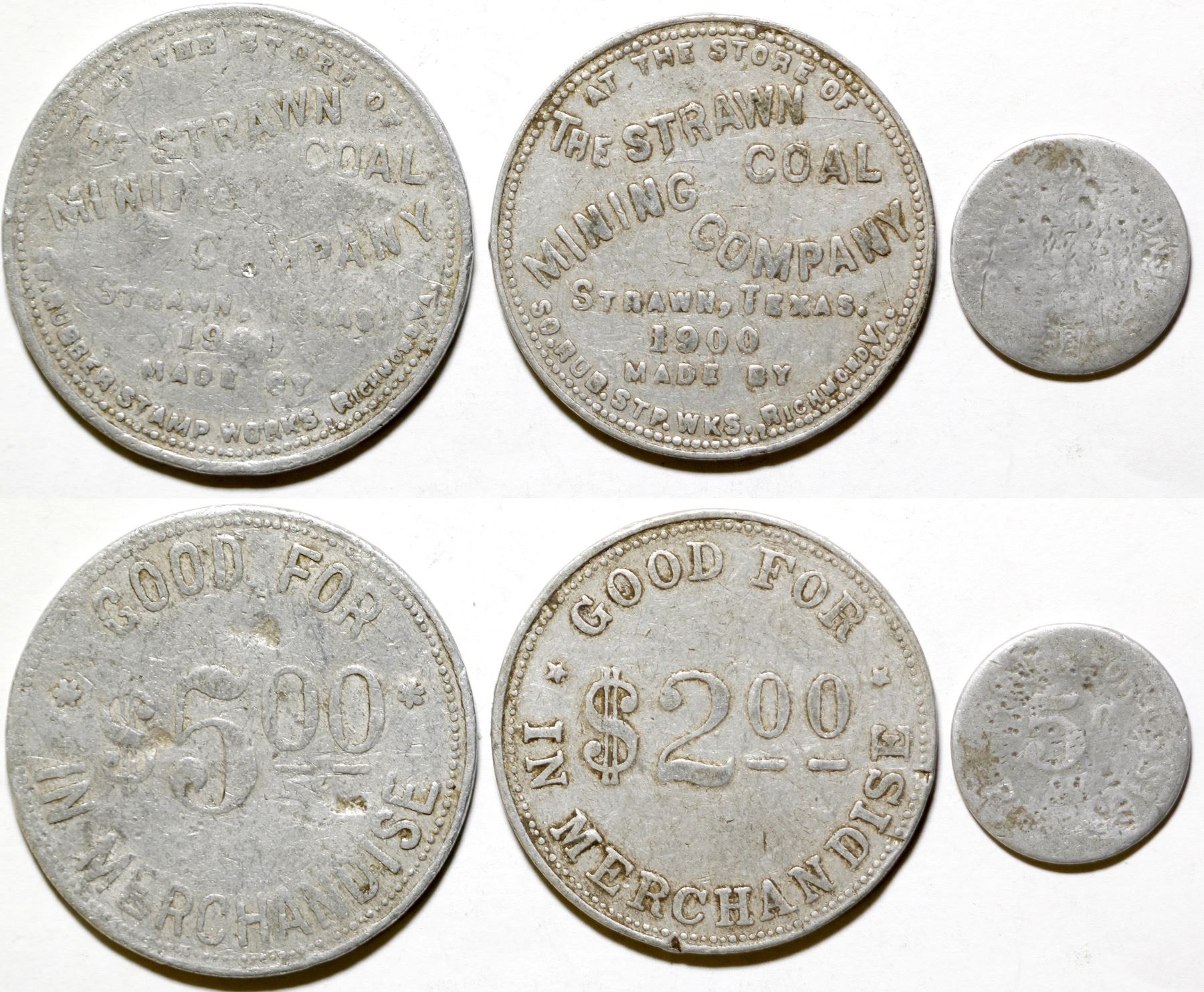 Three pieces. GF 5c, $2.00, $5.00 IM aluminum tokens State: Texas City: Strawn Date: HWAC# 85338
