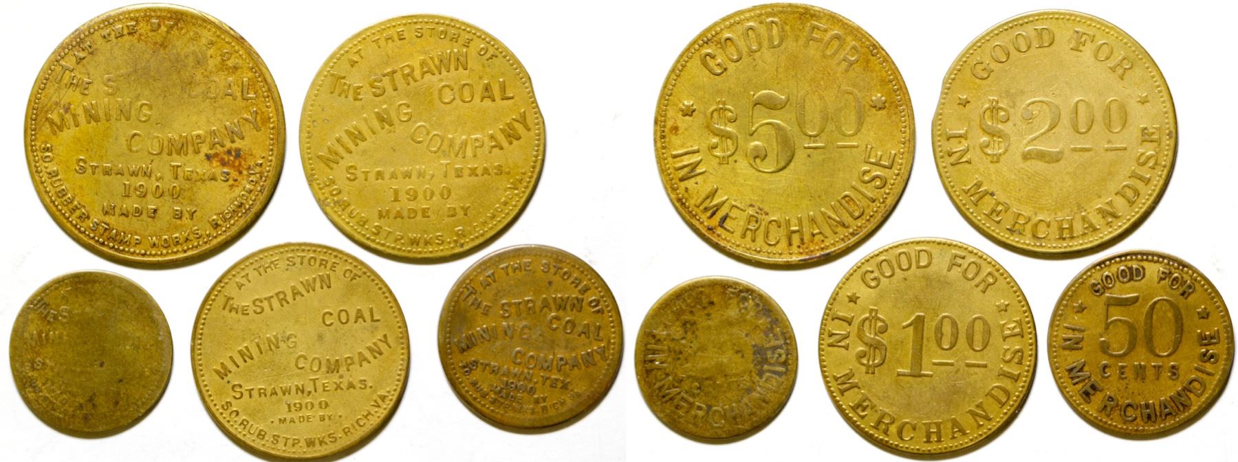 A set of five tokens. 25c, 50c, $1.00, $2.00, $5.00 GF IM tokens from large coal mine State: Texas City: Strawn Date: 1900 HWAC# 85339