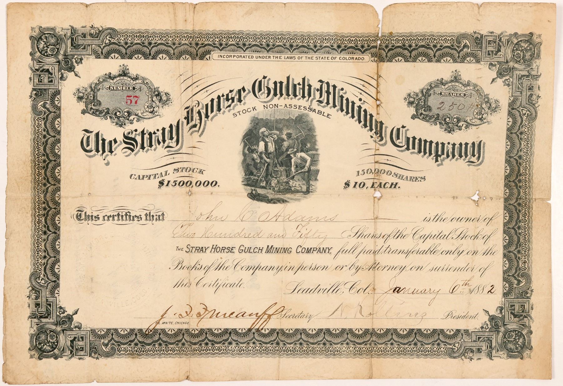 Inc. in Colorado. No. 57, issued for 250 shares to company vice president John C. Adams on Jan. 6th, 1882 in Leadville. Signed by president N. Rollins and secretary JF Frenoff. Not cancelled. Black border and print. Small mining vignette. Printed by FL Waite, Chicago. Many folds and creases, separation, soiling, a few small holes. Please inspect. 7.5 x 11" Owned the Rarus, 300 x 1500 feet situated in Adelaide Park, two miles east of Leadville in the California District. Located in 1877. Developments include one 102 ft. shaft. [Corregan & Lingane, 1883, pg. 438] Ken Prag Collection