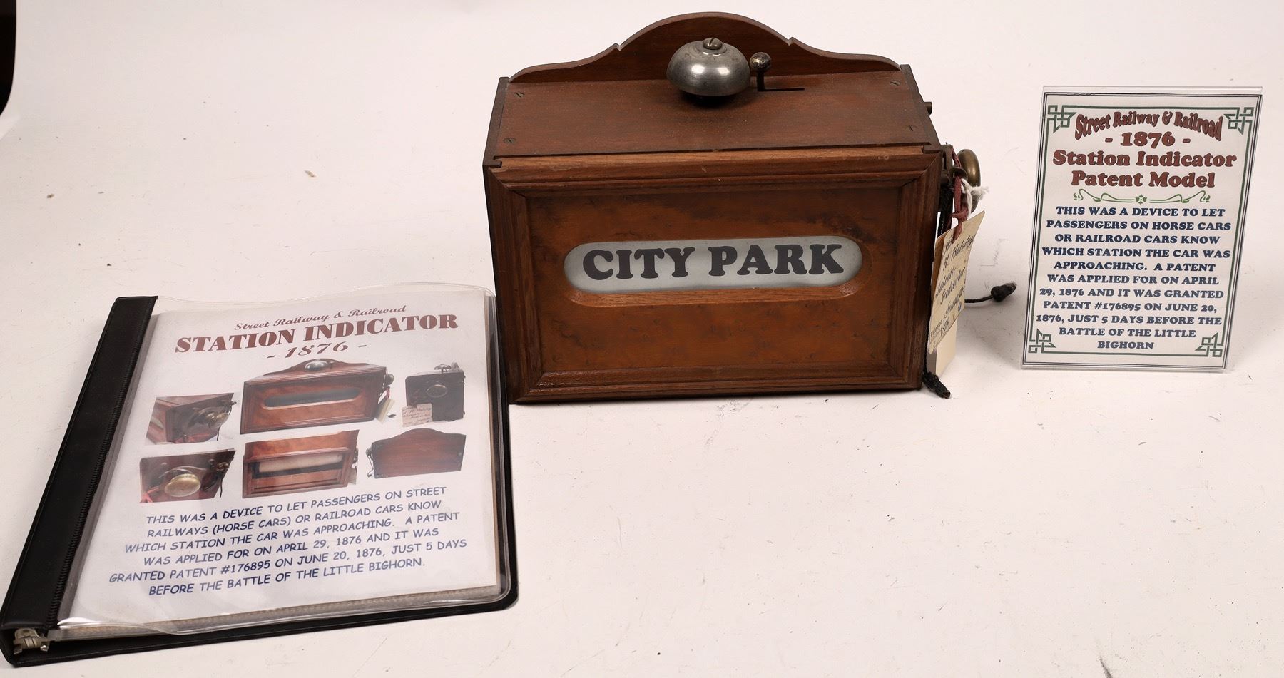 Street Railway Station Indicator Patent Model made by JR Balsley, June 20, 1876, Patent Number 17895, with original US Patent Office tag still attached. This device was used to let passengers on horse or railroad cars know what station the car is approaching. This working patent model is of exceptional quality, complete with bells, and it comes with a notebook of the patent papers.