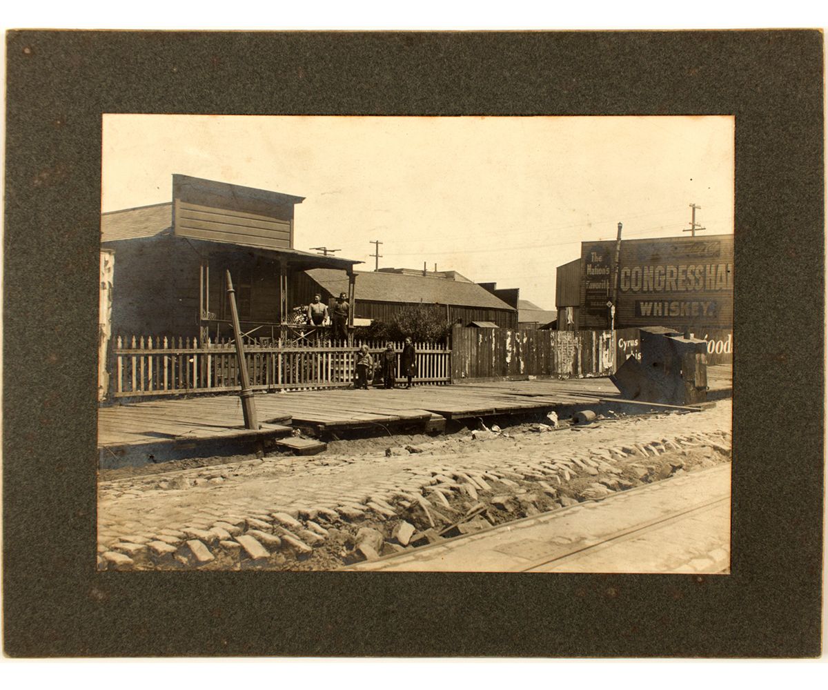 Whiskey advertising on the walls and fences, a family on their front porch.