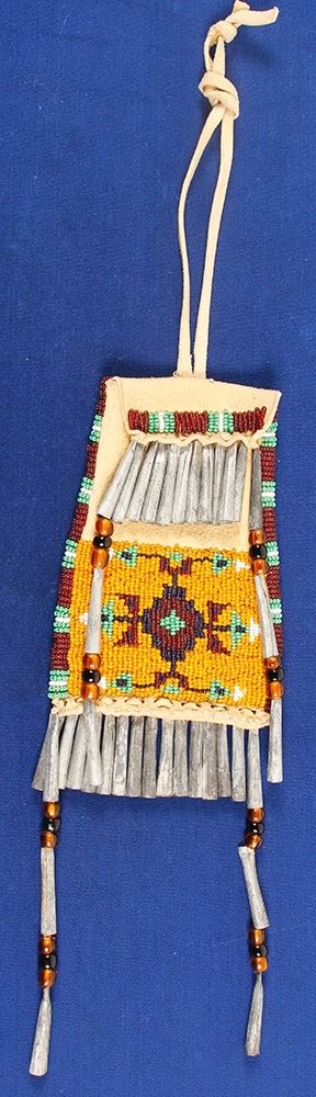Plains Indians Strike-a-Light. Beautiful traditional pattern with tightly woven bead work and tin cones. Probably circa 70’s, originally used to carry firing starting pieces & sometimes fetish pieces. Sadly, once Native Americans were placed on reservations the bags were used to keep and store their ration tickets. HWAC# 62031 Date: Location: