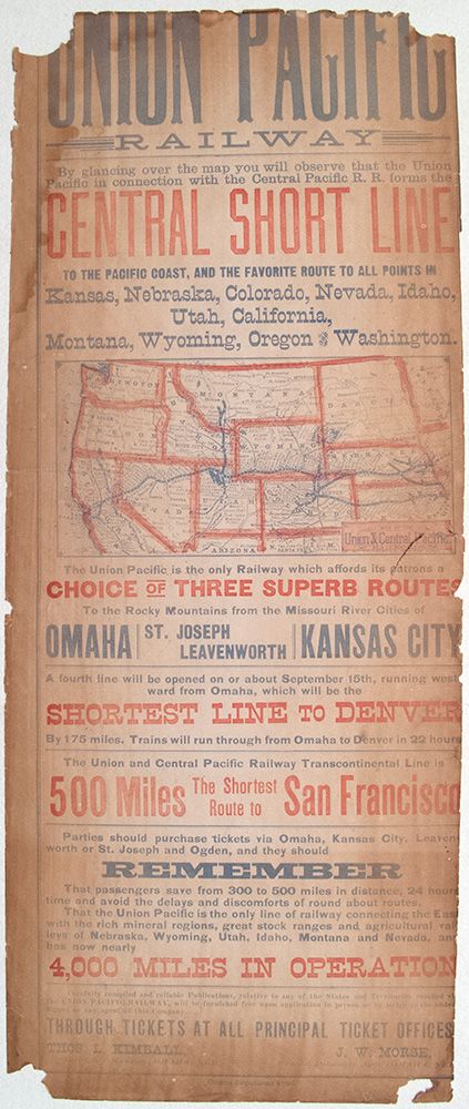 Three colors! Advertises their new route to all points in Kansas, Nebraska, Colorado, Nevada, Idaho, Utah, California, Montana, Wyoming, Oregon, and Washington. Perhaps the first broadside after Union Pacific's Railroad bankruptcy.City: County: State: Date: