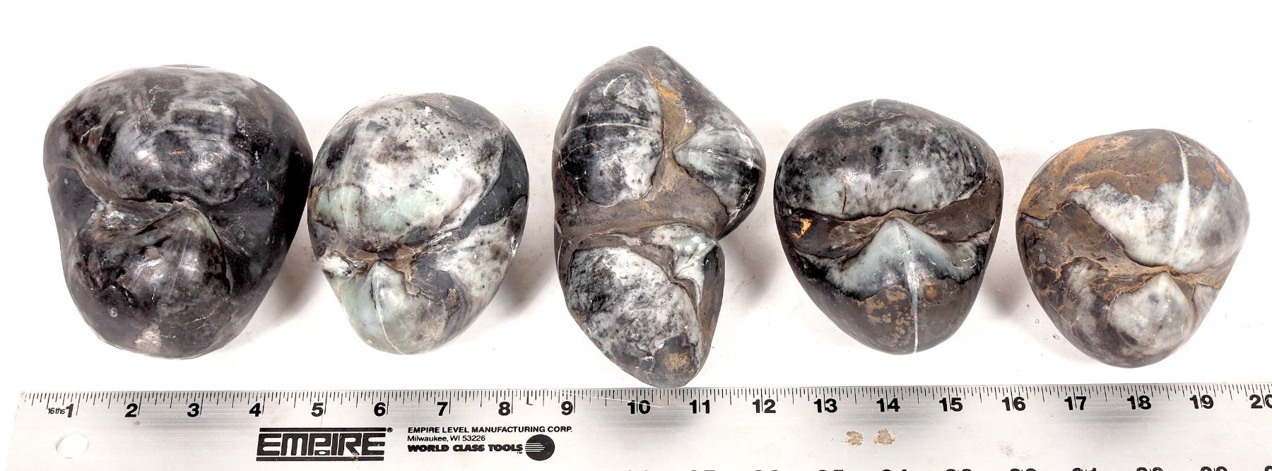 About 15 pounds of stringocephalus fossils. They are the biggest size of single brachiopod. They are shaped like eagle beaks and are about 300 million years of age. Due to their age they can resemble jade. Specimens have been polished and make nice displays.