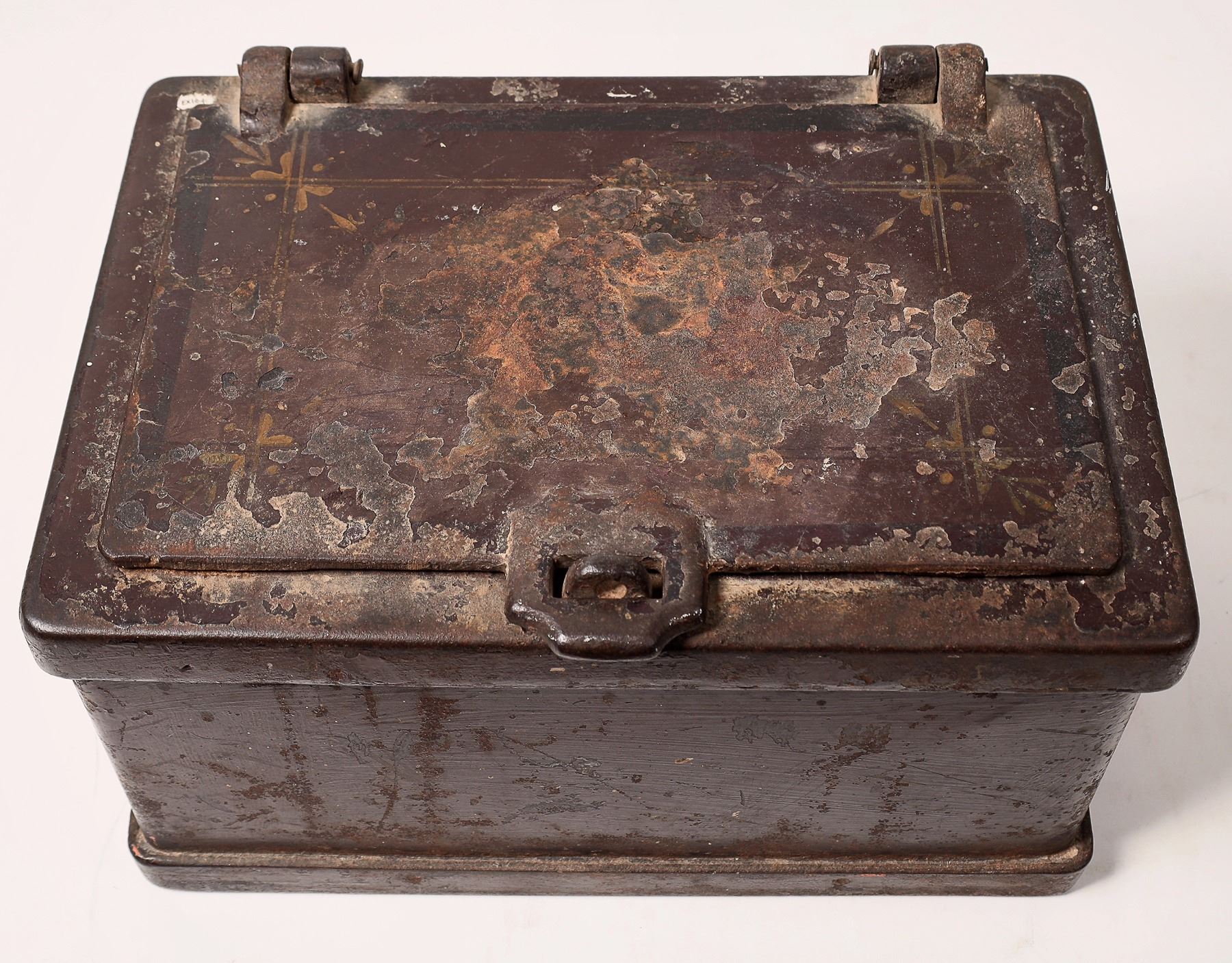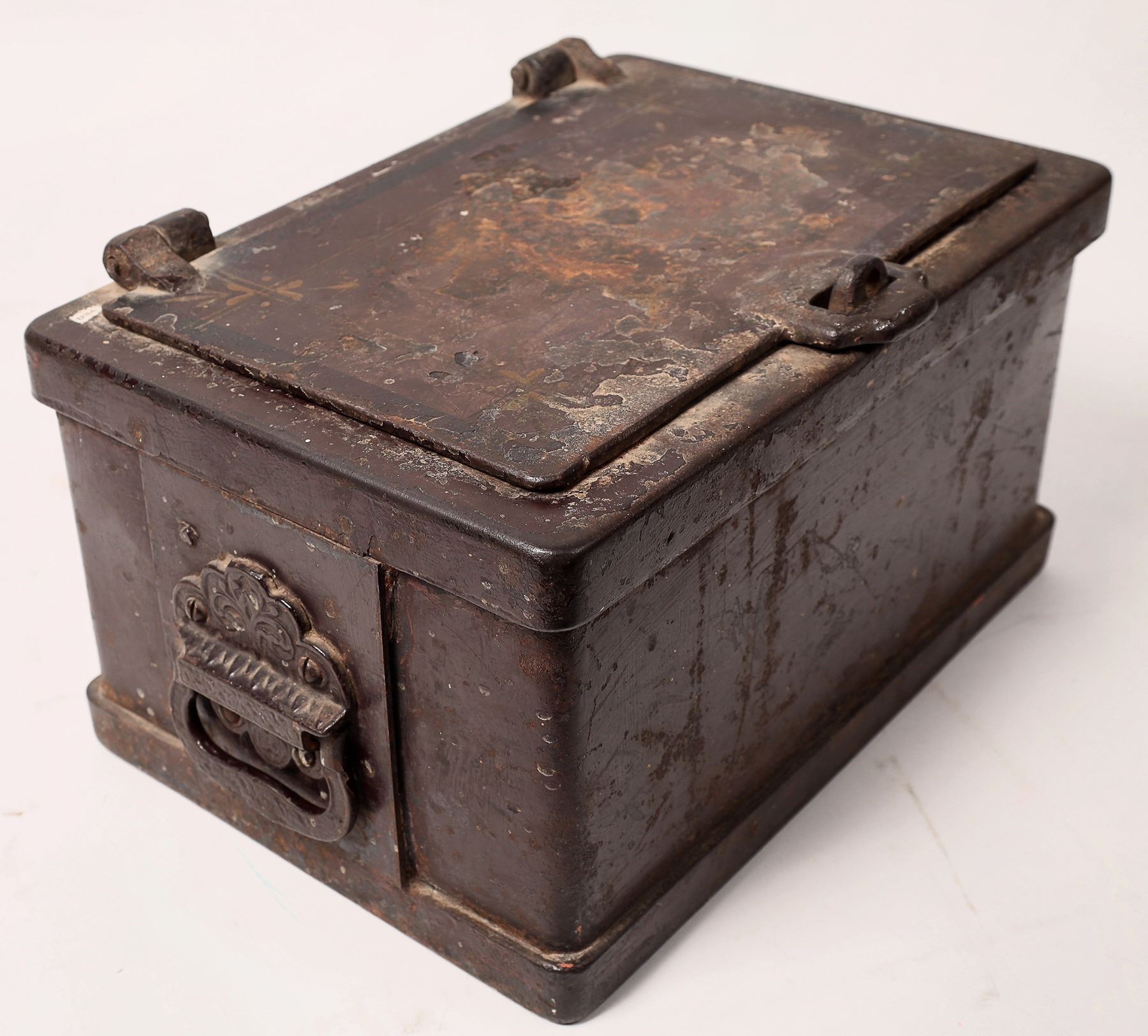 Mid to third quarter 19th century classic strongbox, also known as a floor safe. Hinged top door, with gold and black trim on deep red. Not all paint remains. Heavily insulated, considered fireproof. Handles at ends of 2 long sides. No maker name present. 14x9.5x8". These strongboxes were routinely placed in secret places-under floorboards or a closet for very safe keeping.