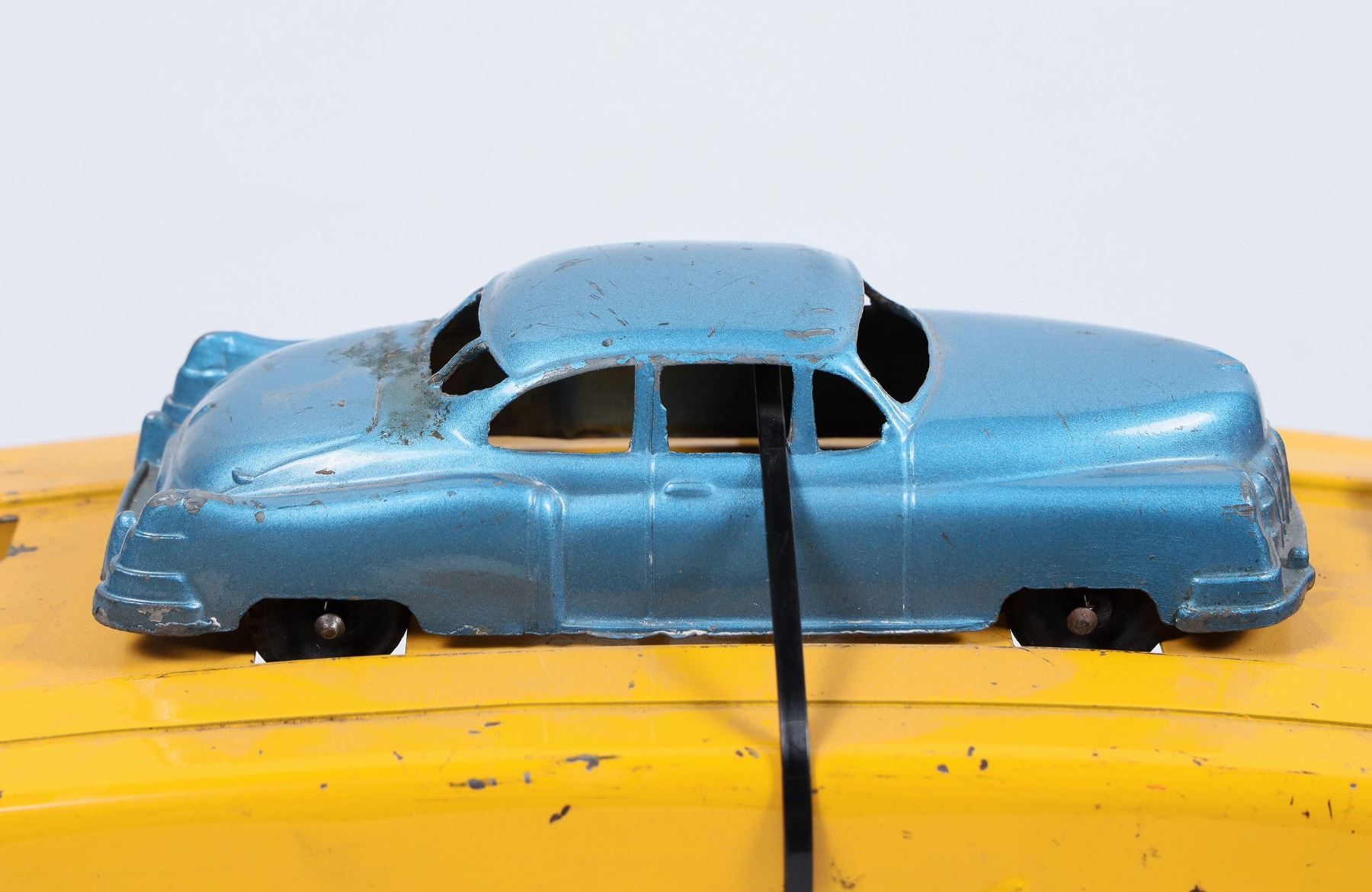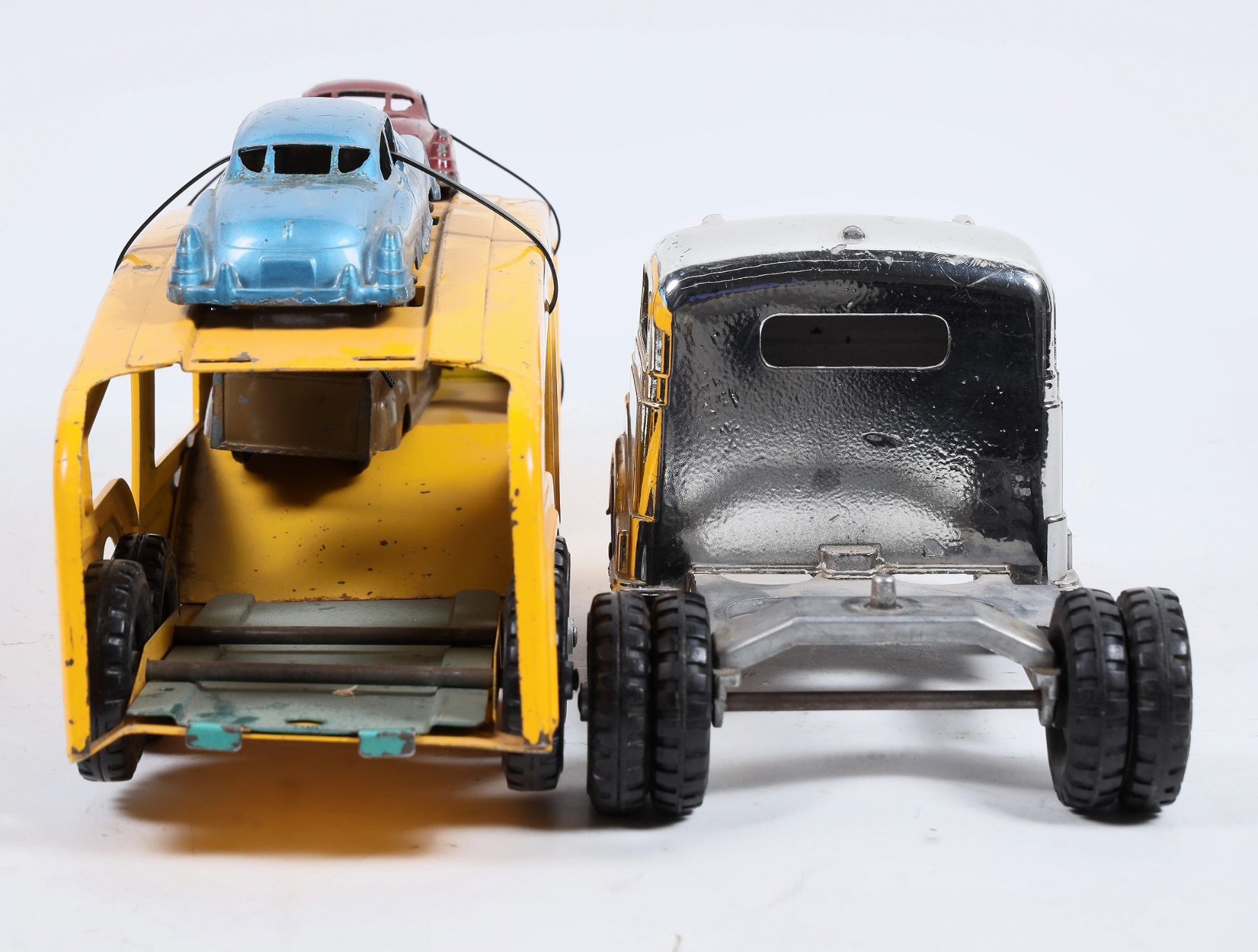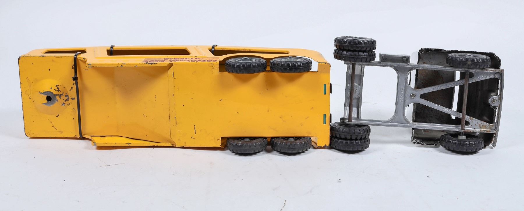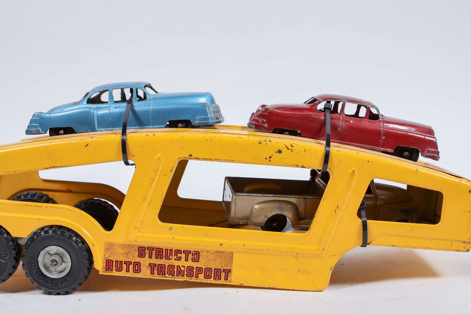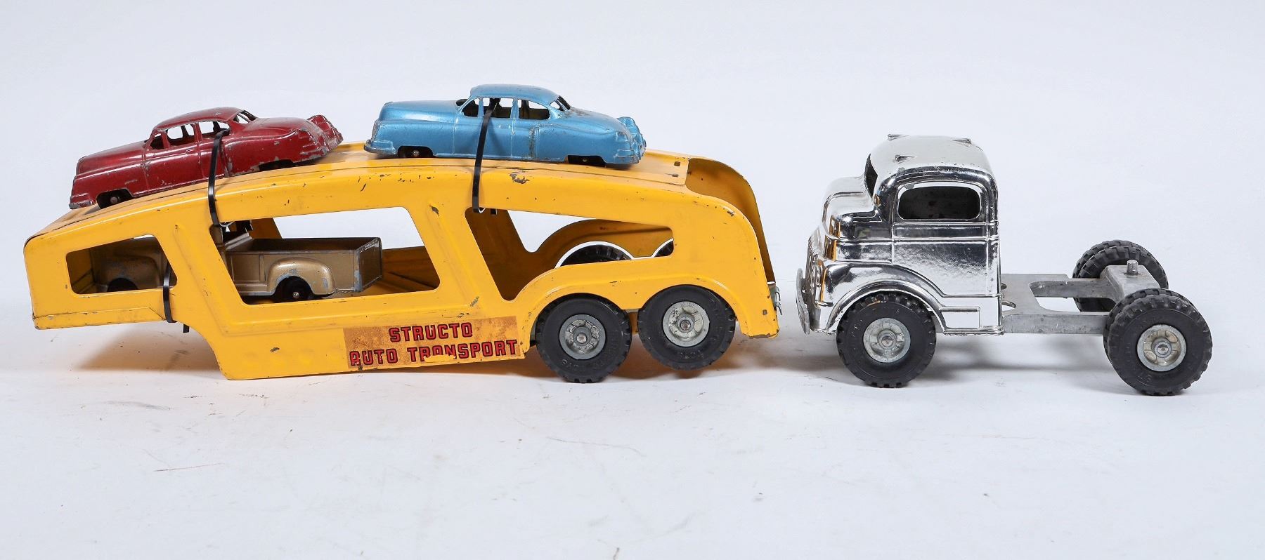 Vintage Structo car hauler w/three cars. Cab is silver and trailer yellow, decals in good condition, overall condition w/orig. paint is excellent. Not many in this condition, great addition. 22” L