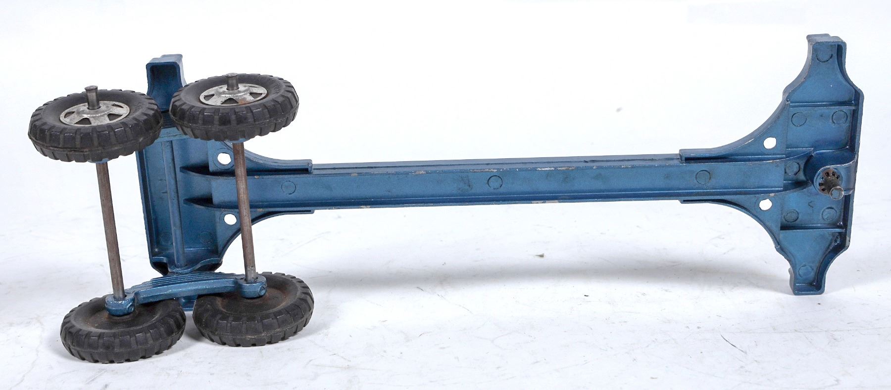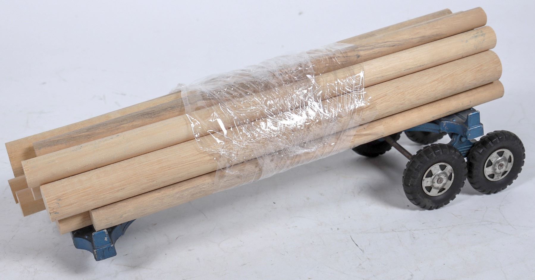 Structo Toys log hauler in a vibrant metallic blue, with 14 pieces of toy logs in assorted sizes. This log hauler is in good working order and ready for its next adventure; see photo. The toy measures approximately 14" long, 5" wide, 4.5" high with logs, and about 3" without logs. The diameter of the largest log is (7/8)", with the diameter of the smaller logs measuring .5". The logs vary in length from 7"-14", with the majority being approximately 13".