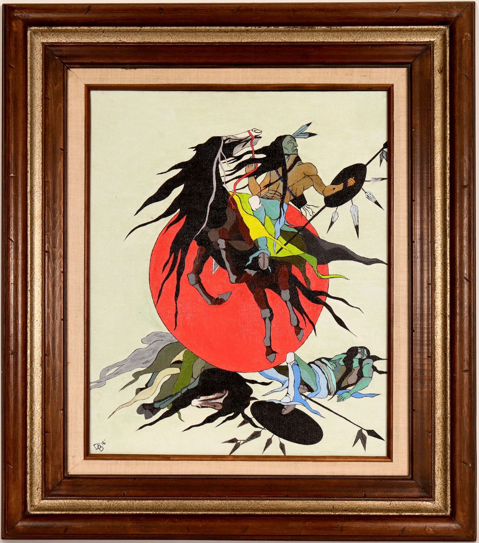 Stylized painting of Native American warrior on horse--dead warrior and horse on ground. Painting is signed DB '76. 20" x 16", linen liner, framed 28" x 24". Painted in bright acrylic/gouache colors on canvas board. DB is probably D B Timmons.